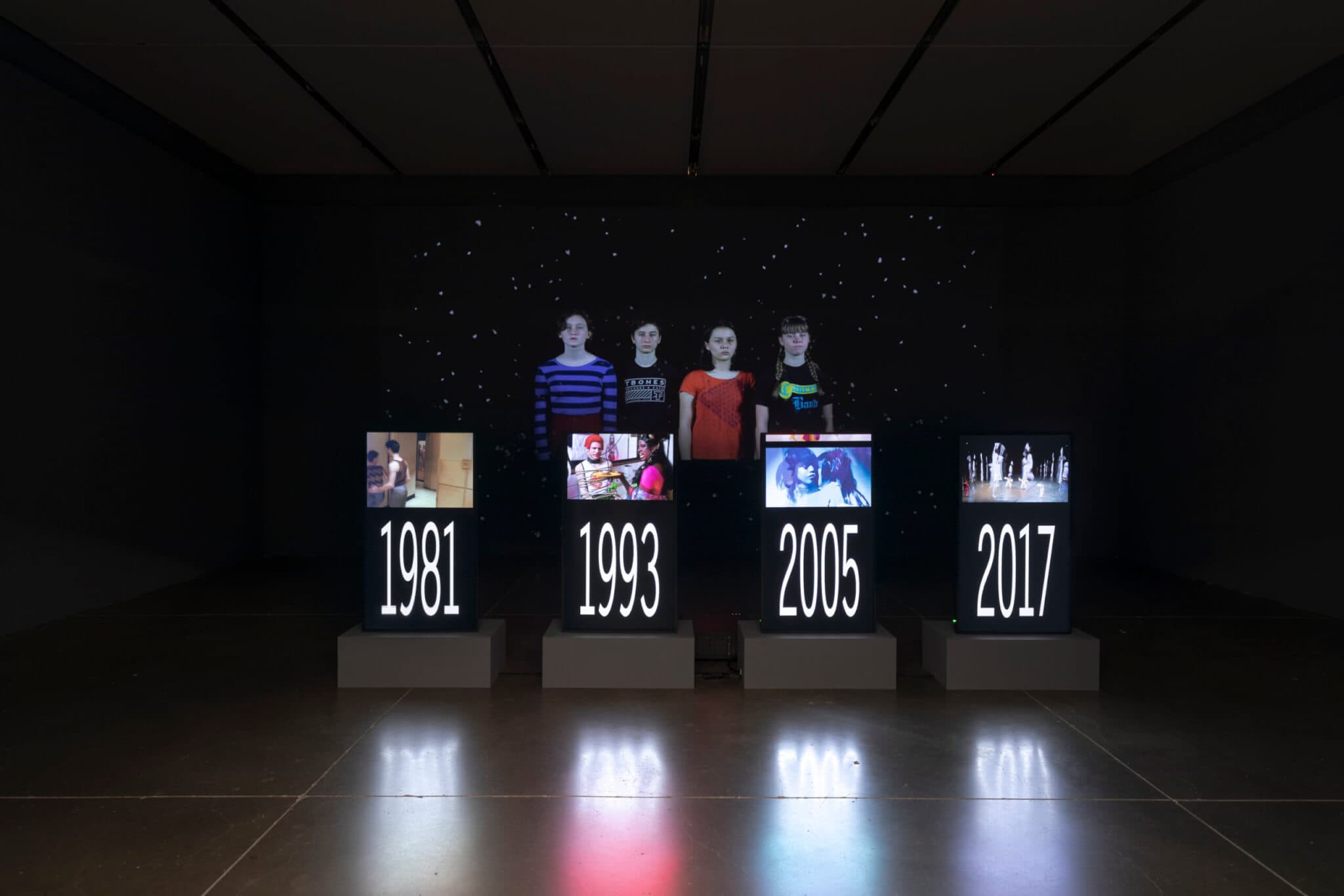 Charles Atlas, The Years, 2018. Six-channel video installation (color, silent; 16:55 minutes), dimensions variable. Installation view, “Charles Atlas: About Time,” the Institute of Contemporary Art/Boston, 2024–2025. Photo by Mel Taing. Courtesy the artist and Luhring Augustine, New York.