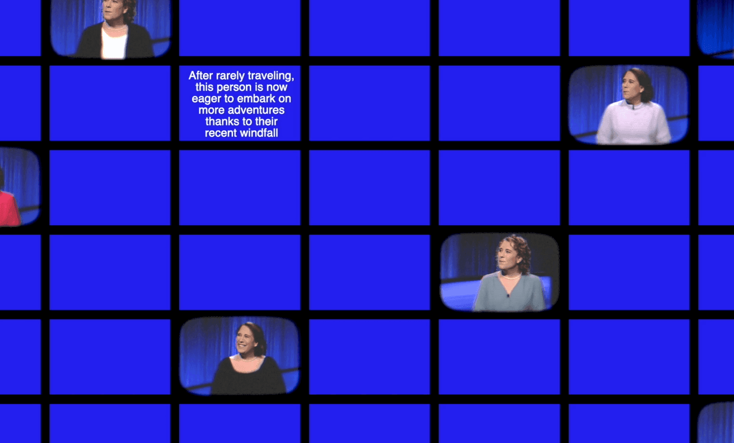 Conceptual video installation artist Elizabeth Withstandley’s latest work is a multi-channel video installation exploring the complexities of personal identity that centers Jeopardy! player Amy Schneider, who had a record-breaking streak of forty days on the trivia show. Assembling daily video clips sharing bits of Schneider’s life and an audio track featuring motivational speakers, spiritualists, and samples from the Ex Machina and Synecdoche, New York soundtracks, the artist uses the concept of “41 facts” to create three unique scripts generated through AI technology. The scripts offer differing versions of the individual—a compelling tension given the work’s title (which seems unattainable given the multiple platforms through which we all communicate who we are to the world)—urging those who engage with the art to examine identity and its fluidity in a world increasingly shaped by technology.