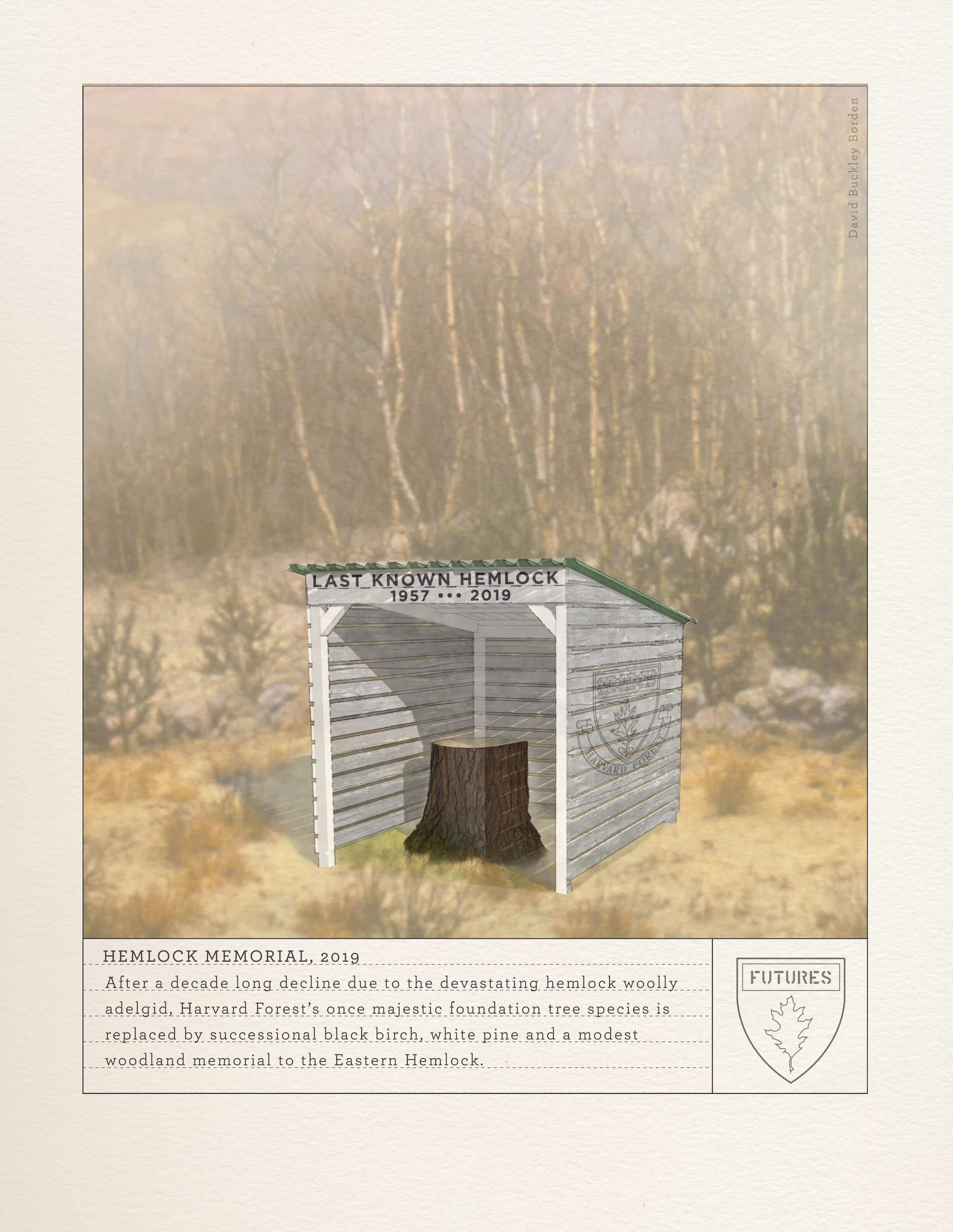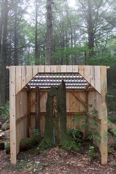 Hemlock Memorial Shed, installation at Harvard Forest, 8 x 8 x 9 feet, wood, acrylic paint, and assorted hardware, 2017. Collaborators: David Buckley Borden, Mike Demaggio, Aaron Ellison, CC McGregor, Jared Laucks, and Lisa Q Ward. Photograph © David Buckley Borden and used with permission.