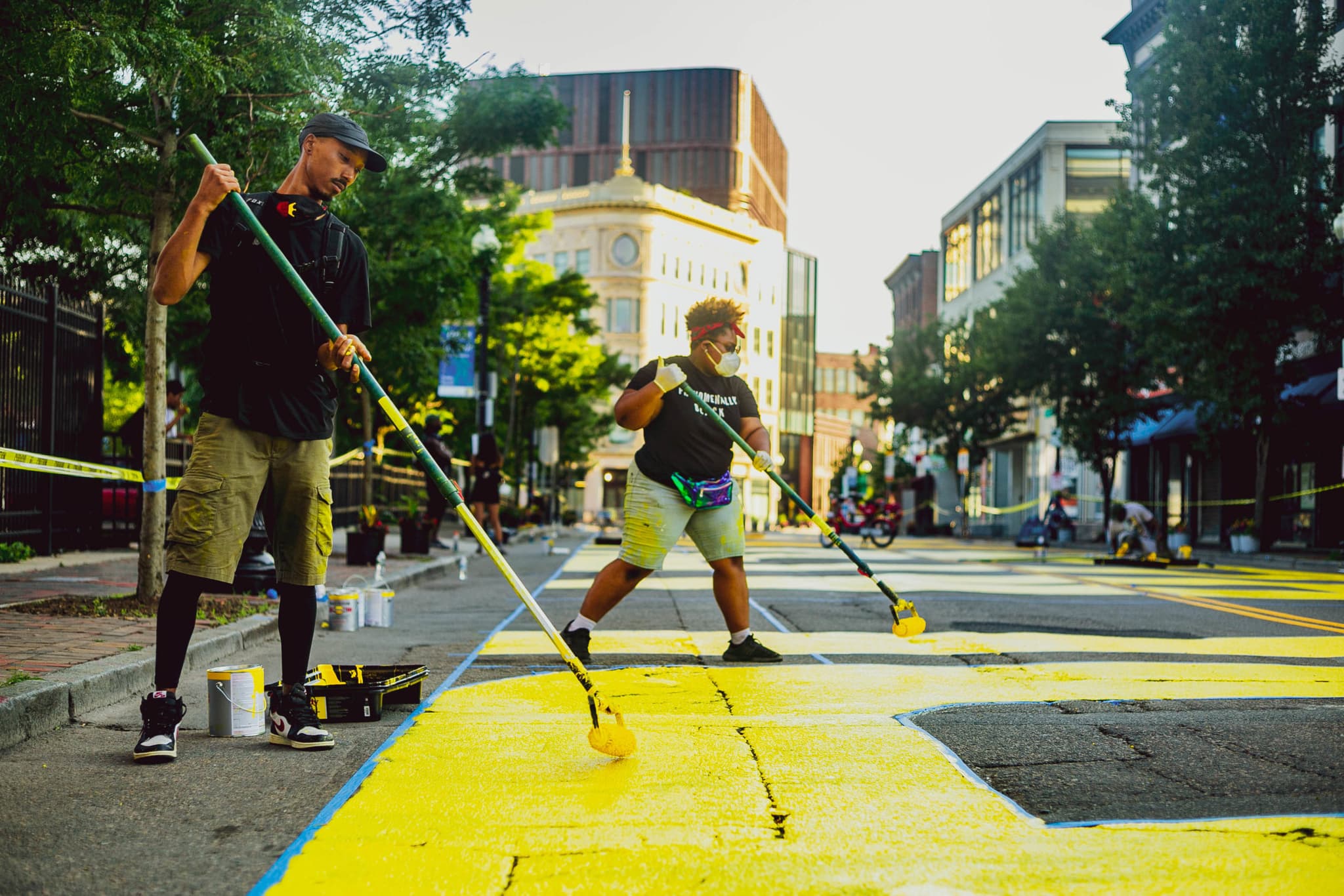 Artists Paul “Mars” Chapman and Chanel Thervil painting the Black Lives Matter mural onto Washington Street between Eustis Street and Palmer Street in Nubian Square on July 5, 2020. Photo by Lauren Miller.