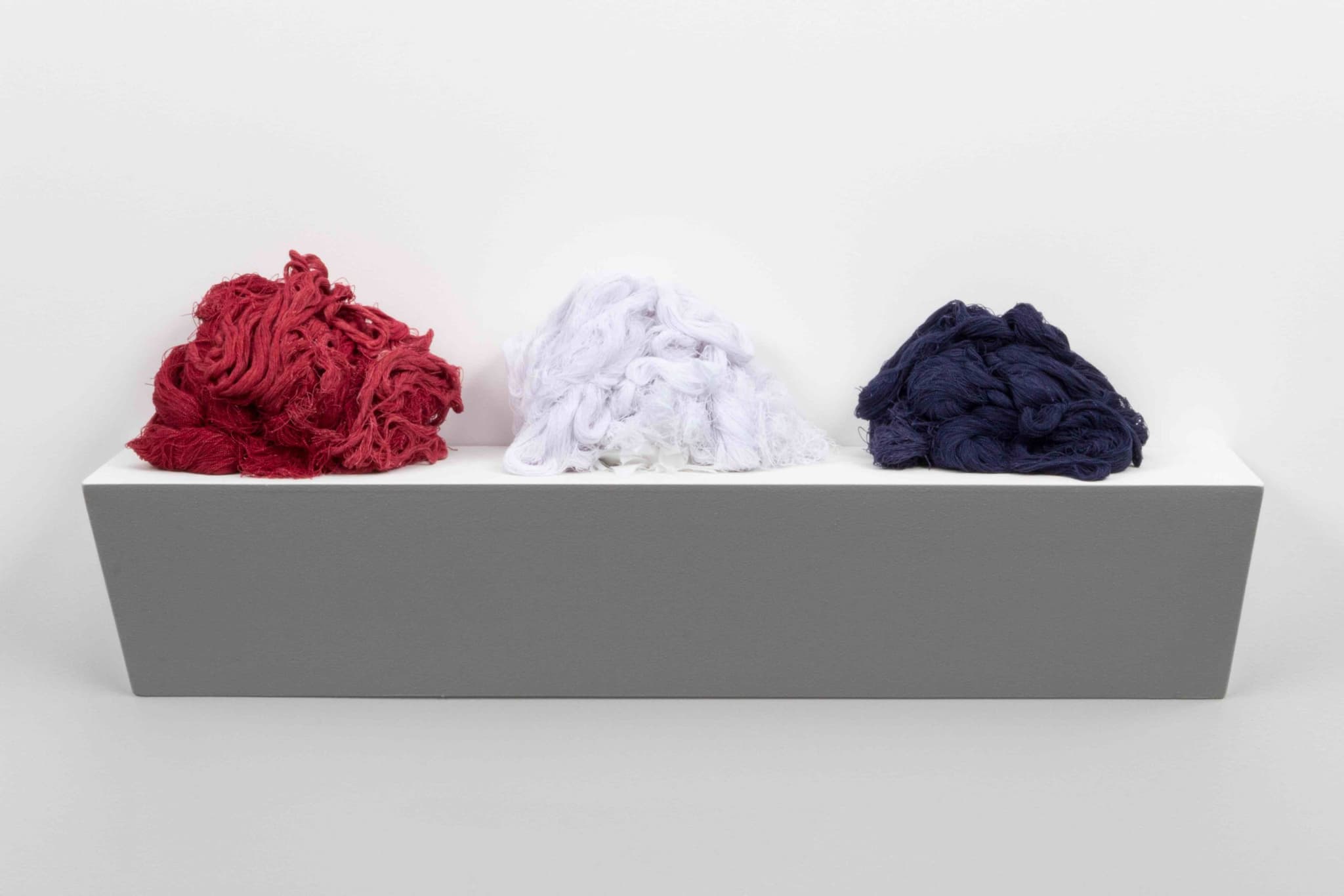 Unraveled, 2015. Completely unraveled cotton Confederate battle flag and shelf,10in x 3ft x 7in.