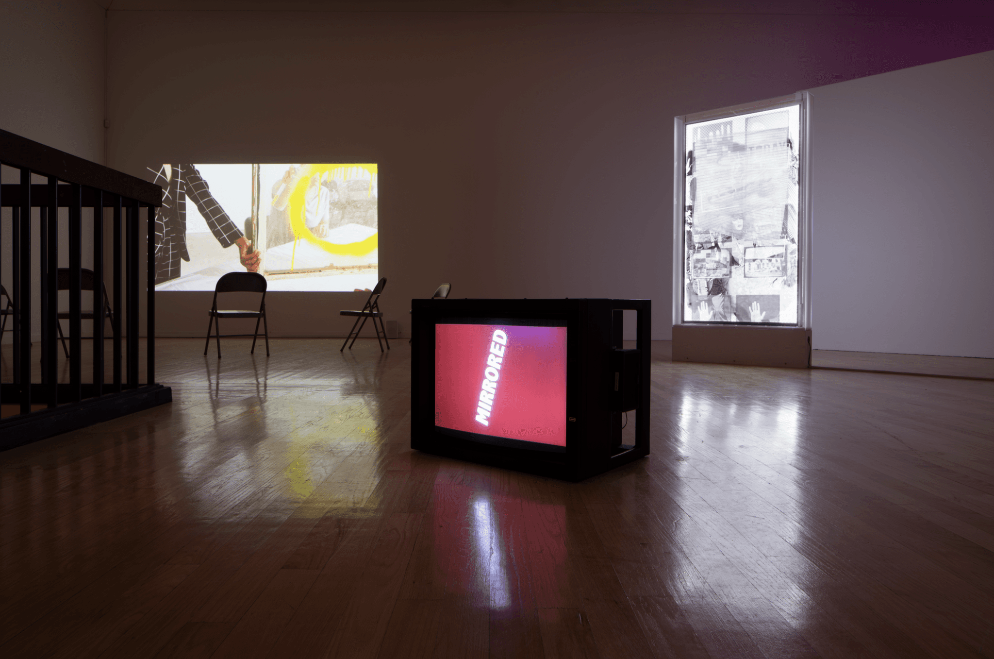 Installation view of (foreground) Good Jazz, 2017, single channel video, color, 6 minutes, 41 seconds, and (background left) The Circle, 2020. Single-channel video. 24 minutes, 38 seconds. Courtesy of the artist and Anat Egbi