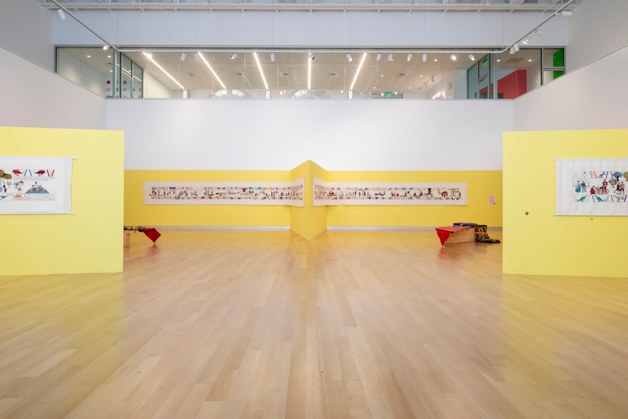 Sawatzky’s stitches are equally vibrant and colorful through all of the eras, cultures, and locations the tapestry depicts. The narrative unfolds from left to right in a linear manner. This method is rooted in the logic of Western teleology, or direct causality of one event to the other, a single perspective that my students commented on. Usually, this critique would discount the message, yet an affirmative sensibility emanates from the work.