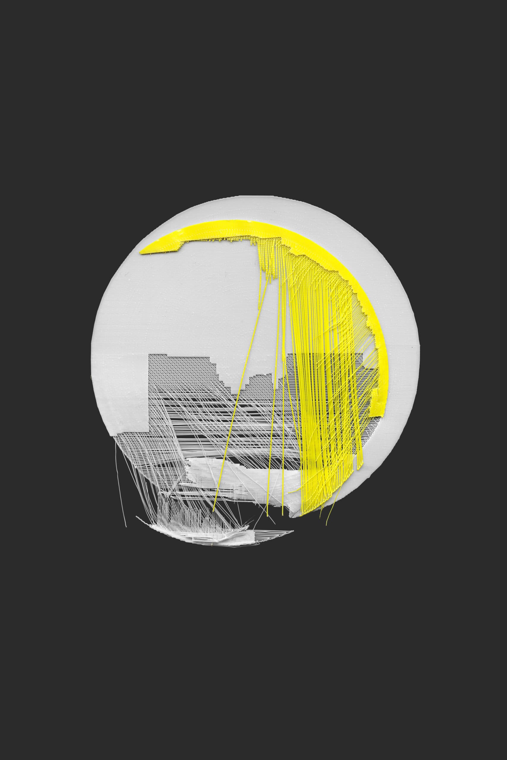Like Szegedi’s work, imperfections anchor Sarah Trahan’s multimedia “Hand of the Machine,” too. Trahan, who is trained as a photographer, uses build plates left over from 3D-print jobs and other bits of detritus for this work. Trahan inks up the build plates and makes black and white prints. She then scans the prints and turns them into animated gifs, flaws and all. In this way, her work is “a collaboration with the machine,” says Bradbury. At the gallery, Trahan’s 3D printer busily spits out objects while loom-like animated gifs flutter on-screen and 2D prints appear to pop off the walls.