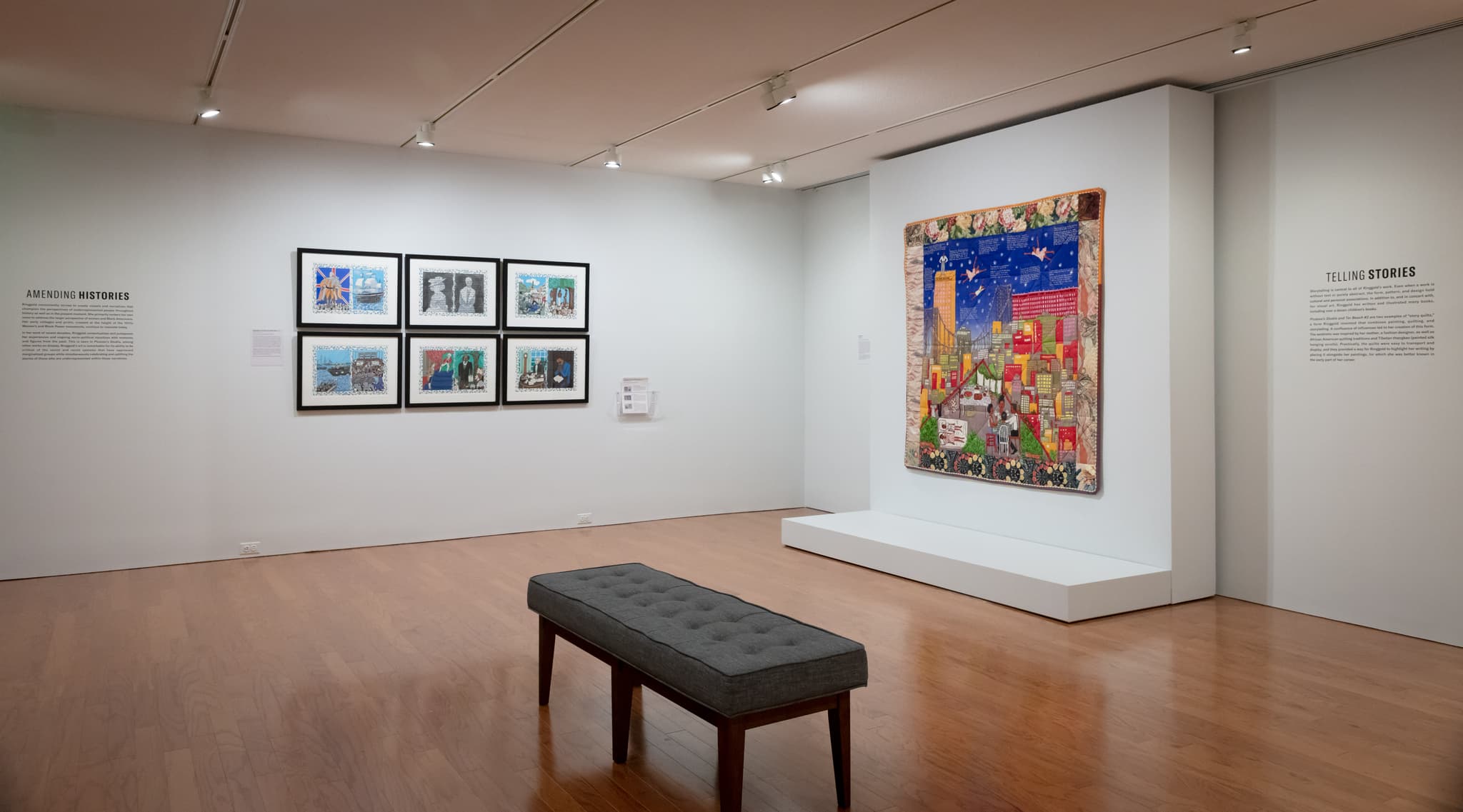 Installation view, “Faith Ringgold: Freedom to Say What I Please,” Worcester Art Museum, 2023. Photo courtesy of the Worcester Art Museum. (left) Faith Ringgold, Declaration of Freedom and Independence, 2009. Acrylic on paper (set of 6). (right) Faith Ringgold, Tar Beach #2, 1990. Silkscreen on silk, 1st edition. © Faith Ringgold / Artists Rights Society (ARS), New York, Courtesy of ACA Galleries, New York.
