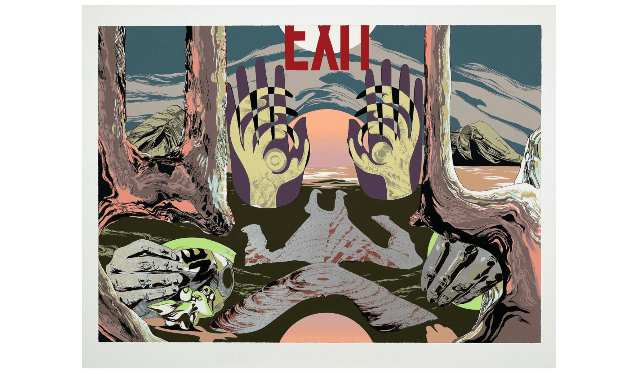 Andrea Carlson, Exit, 2018. Screenprint. Sheet: 34 in x 48 in; 86.4 cm x 121.9 cm; Frame: 33 5/8 x 47 in. Mead Art Museum at Amherst College, Purchase with Trinkett Clark Memorial Student Acquisition Fund; AC 2020.04. © Andrea Carlson. Image Credit: Petegorsky/Gipe.