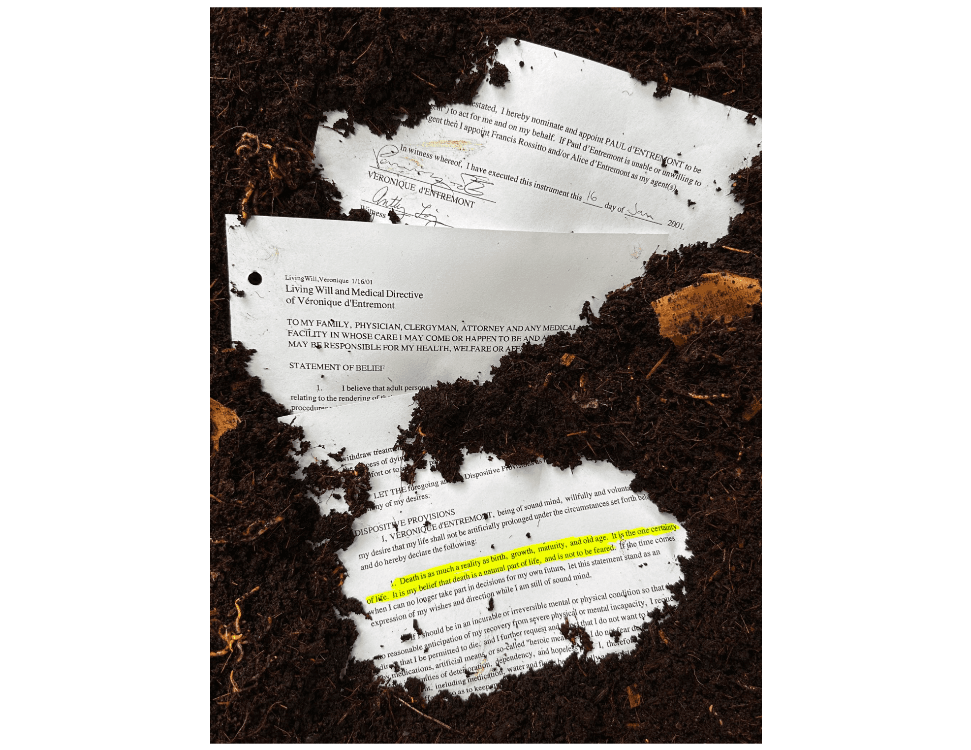 veronique d’entremont, Being of Sound Mind, 2023. composting worms, dirt, medical directive signed by the artist upon their 18th birthday. Photo courtesy of the artist.