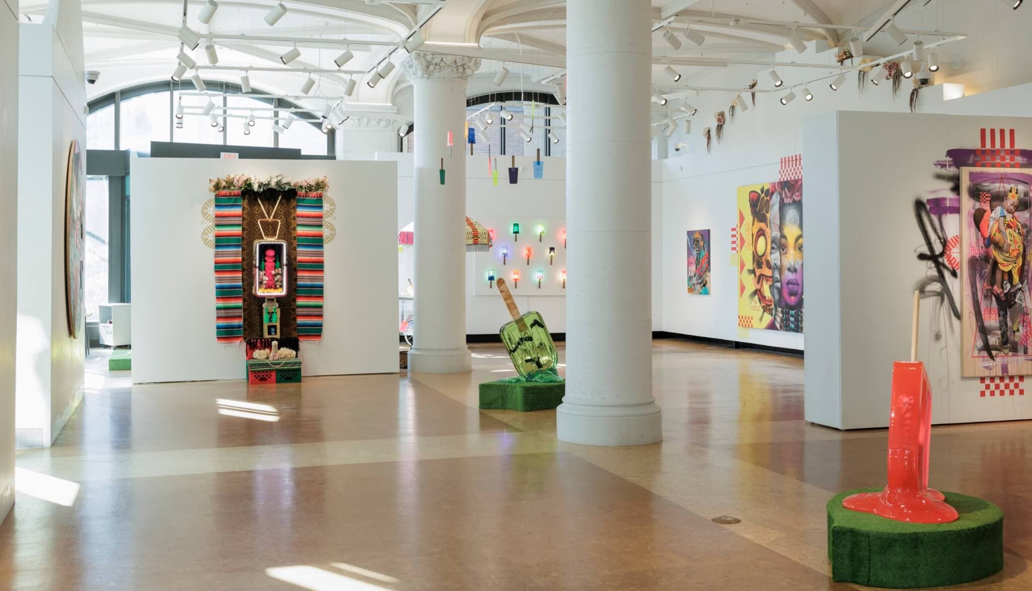 At Boston University’s Stone Gallery, “Ni de Aquí, Ni de Allá” is an exhibition that is immersive, bright, layered, and fully alive. Victor “Marka27” Quiñonez blends graffiti, hip-hop, Chicanx aesthetics, and pop culture in ways that feel both muralistic and intimate, but also a bit rebellious. There are works whose graffiti lines spill out past the canvas boundaries and onto the white walls of the gallery. The I.C.E cream truck hits with humor and urgency, while the pop-up botánica quietly holds memory and ritual in candles, flowers, and devotional objects. The work makes presence and displacement tangible, celebrating resilience and identity in ways that are immediate, messy, and unforgettable, without ever feeling like it’s trying too hard. It’s cheeky but not rushed, and it’s this level of care that Marka27 clearly infuses into his work that shines the brightest. —Emmy Liu