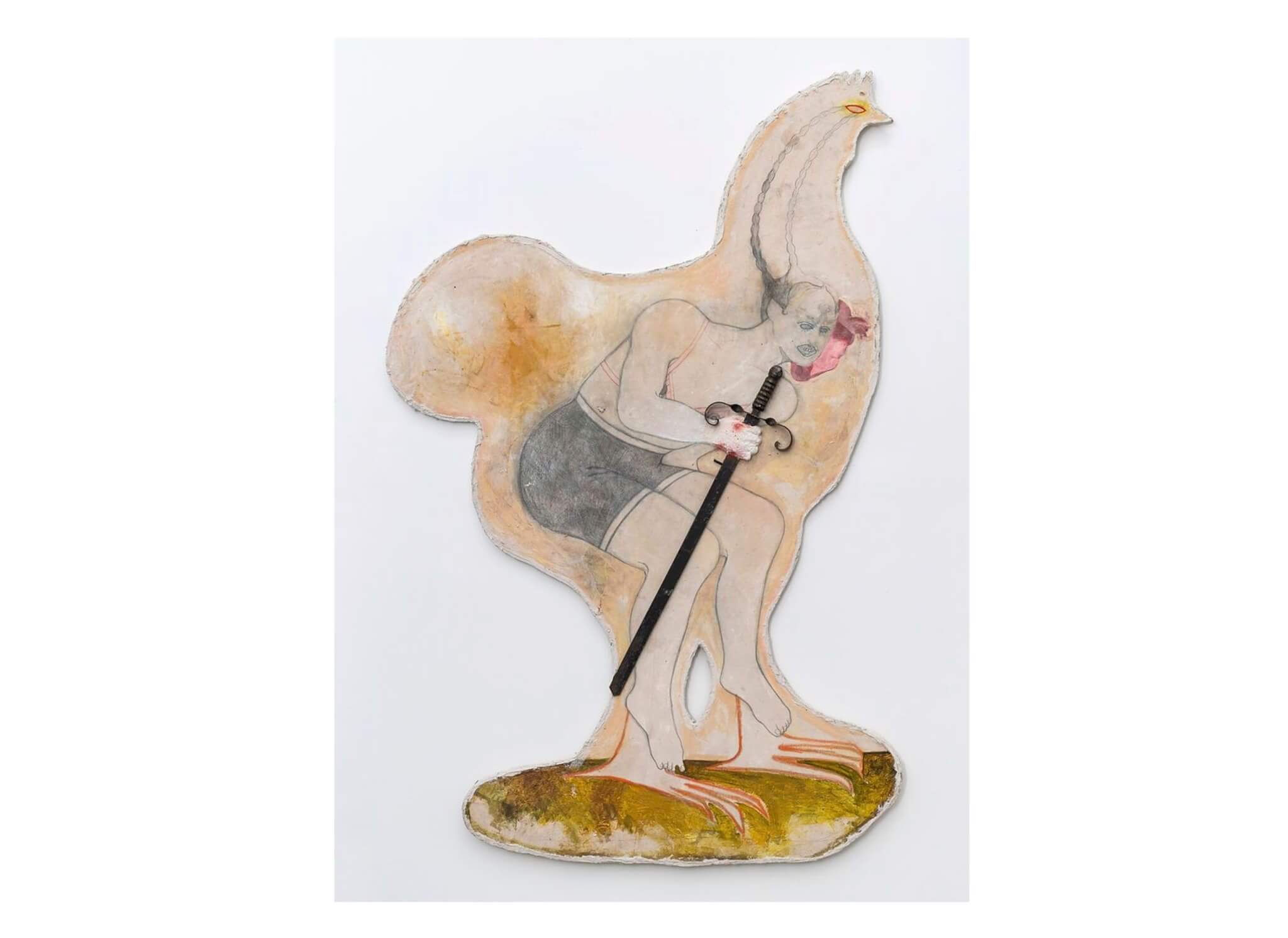 Amy Bravo, Trojan Rooster (Day Stalker), 2024. Graphite, wax, pastel, acrylic, epoxy, and steel on canvas mounted on plywood, 76 x 50 x 1 inches. Courtesy of University Hall Gallery, UMass Boston.