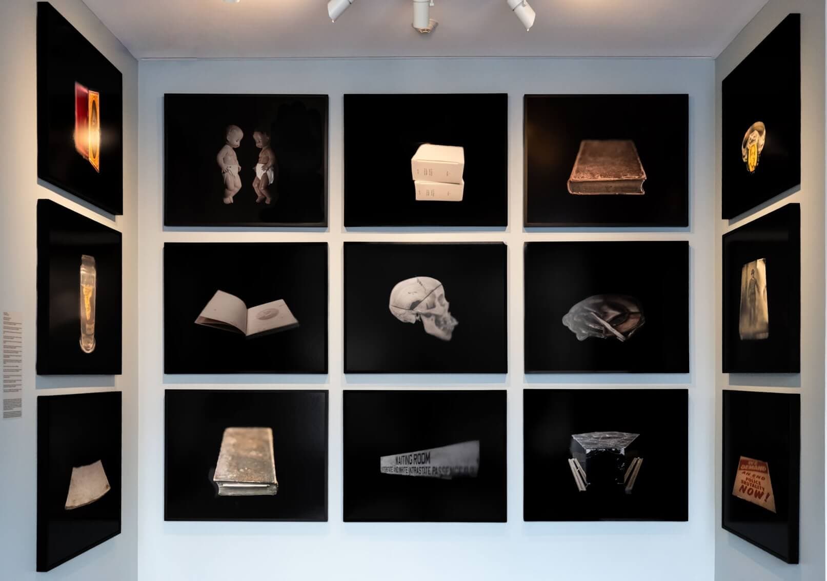 A grid of Wendel White’s work covers a wall across from the entrance. This show overlapped with White’s solo show “Manifest: Thirteen Colonies” at the Peabody Museum of Archaeology and Ethnography on the other side of Harvard Yard. Both highlight works from White’s Manifest portfolio, for which he photographs artifacts about race as it is constructed by and represented in American material culture. At the Cooper Gallery, White’s photographs feature an array of objects—a graduation ring with one man’s photograph affixed to it, the Narrative of Sojourner Truth (1850), a skull inscribed “Negro,” and several others—that are all photographed singularly and positioned at the center of a black background. Across Manifest, this intended decontextualization of the artifacts queries the unique social implications of each object. However, the images themselves do not sit without context: The site of the exhibition in which they appear shifts the bounds of those implications. Displayed in the Peabody Museum, White’s work challenged the institution’s collection of anthropological materials from within by highlighting objects as tools of change across history and questioning what is preserved and what is not. Whereas alongside the other artworks at the Cooper Gallery, the work commands a form of remembrance that begets our contemporary collective state. The Cooper’s context pushes through a rumination on (and condemnation of) the past, and toward an understanding of how futures are built.