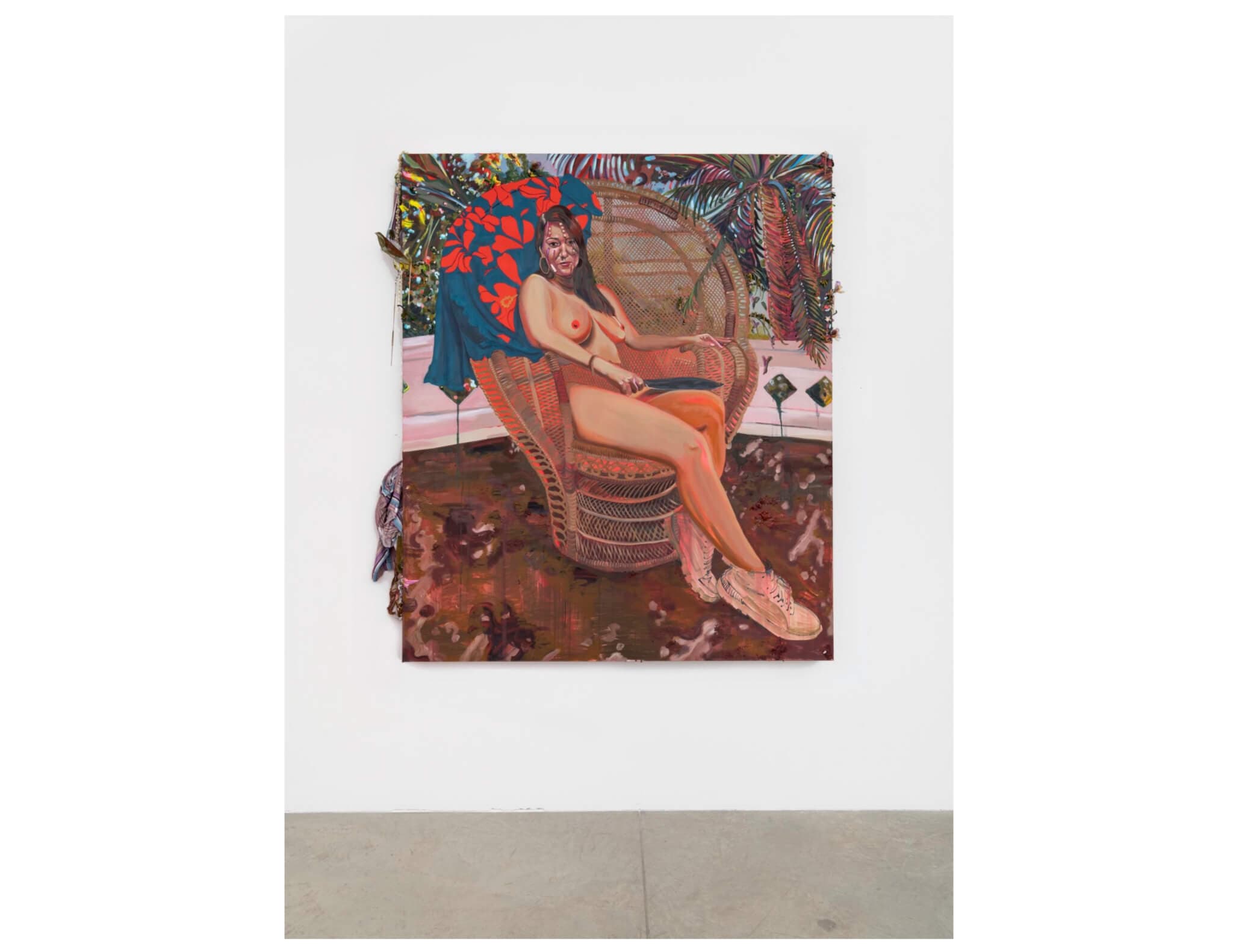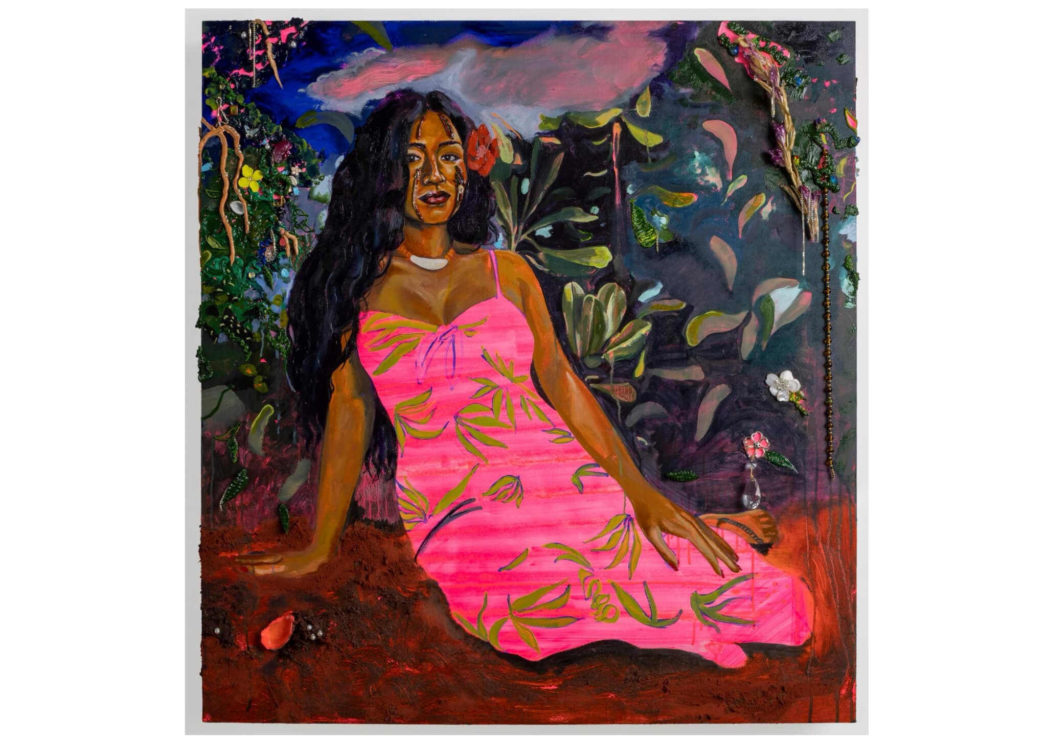 McDaniel’s oil paintings, embedded with personal and oceanic memorabilia, feature highly present, semi-nude female figures, permeated by tropical shades of pink, yellow, and green. These bright, almost celebratory tones function as a Trojan horse—drawing viewers into more serious reckonings with sexual and colonial trauma. Holding the active gaze of the sitters, I realized that my inclement journey, ending in a kaleidoscopic horizon, parallels the bond between the artist and her sitters. McDaniel’s work explores sexual and colonial trauma and transforms its wretchedness into a collective bond, an atmosphere of autonomy and presence that instantly registers as upending the asymmetrical painter-sitter relationship.