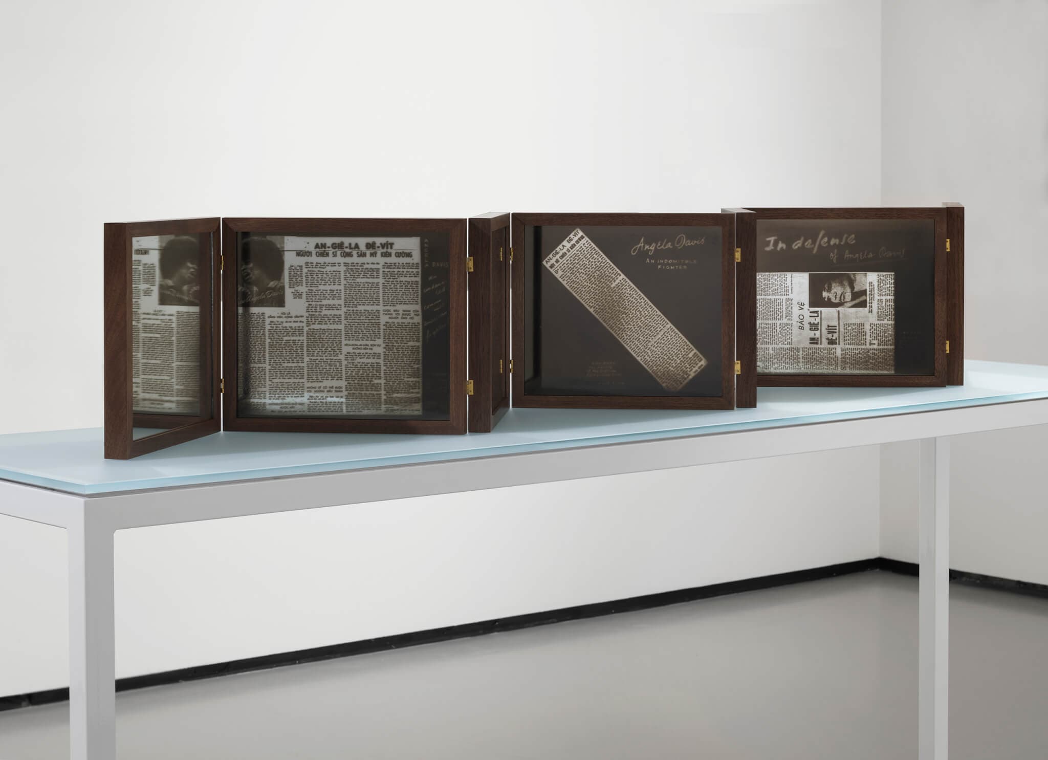 “With love from your Vietnamese sisters” marks Trương’s return to the Harvard Radcliffe Institute, this time with a solo exhibition curated by Caitlin Julia Rubin. Each of the works responds to a scrapbook that was crafted by the South Vietnam People’s Committee for Solidarity with the American People and gifted to Black feminist philosopher and former political prisoner Angela Davis in 1972. Housed in the Radcliffe’s Schlesinger Library, the contents of this scrapbook—Vietnamese articles reporting on Davis’s trial and messages of support for her—echo throughout the space.