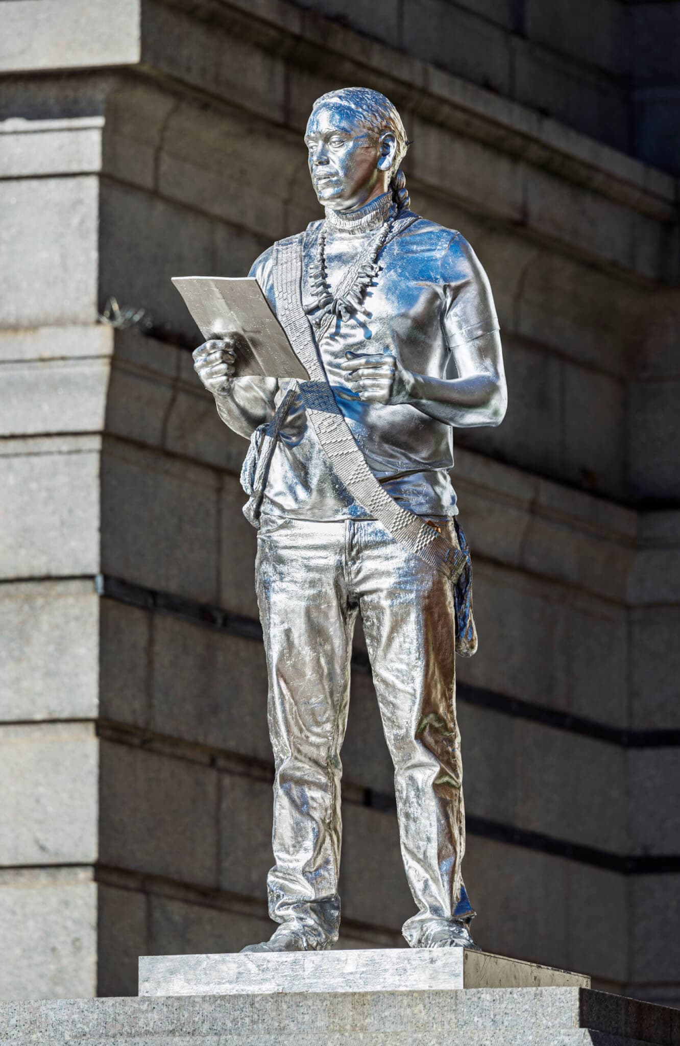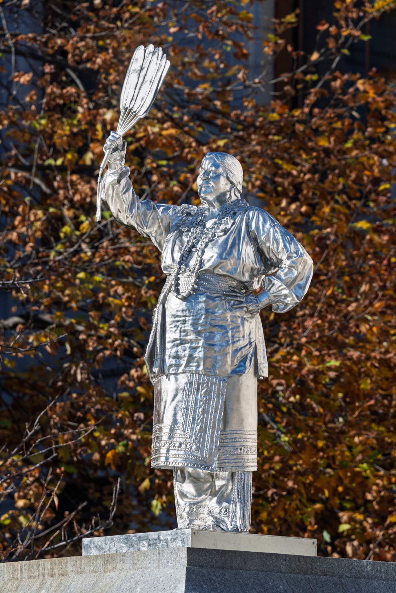 Alan Michelson completes the quadrumvirate of influential Native artists involved in the Triennial. His offering: The Knowledge Keepers (2024), two bronze-cast, silver-gilded statues dedicated to celebrating local Indigenous artists and leaders. One depicts a Native matriarch, her left arm akimbo, her right elevated with an eagle feather fan and modeled after Aquinnah Wampanoag member Julia Marden. In life, she fashions her regalia from scratch, preserving techniques passed down through generations.The second statue represents Nipmuc descendant Andre StrongBearHeart Gaines, Jr., and depicts him reading a document in traditional clothes. Gaines builds wetus—traditional homes—and organizes for Native rights. Neither achieved fame through conquest or politics. They’re knowledge keepers, not empire builders.