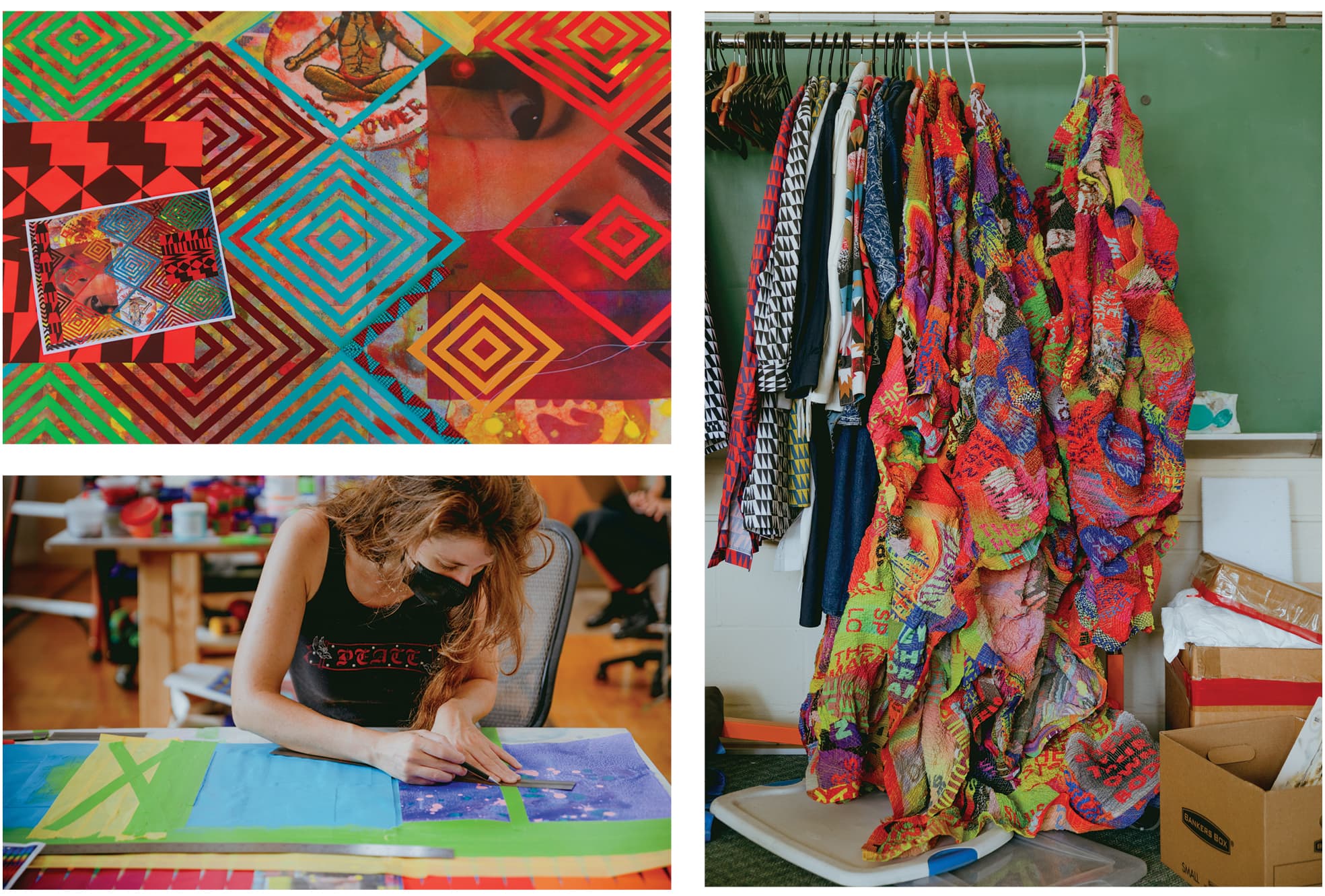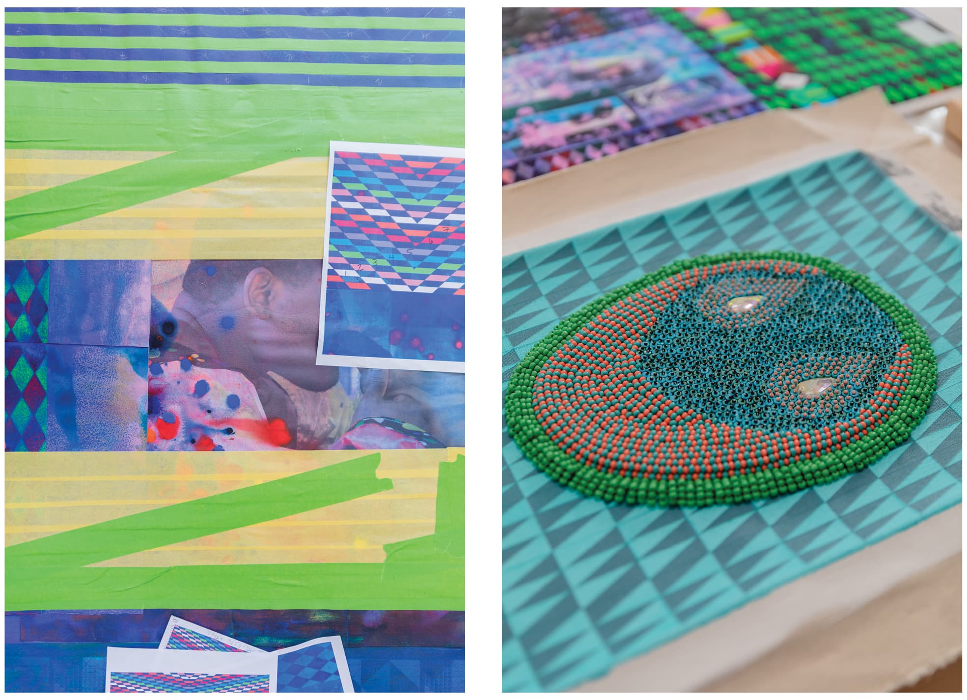 [Left] Details from unfinished works on paper that draw from collaged materials within Gibson’s multi-decade archive. [Right] Hand-beaded figures, patterns, and frames are present in many of Gibson’s works. Photos by Mel Taing.