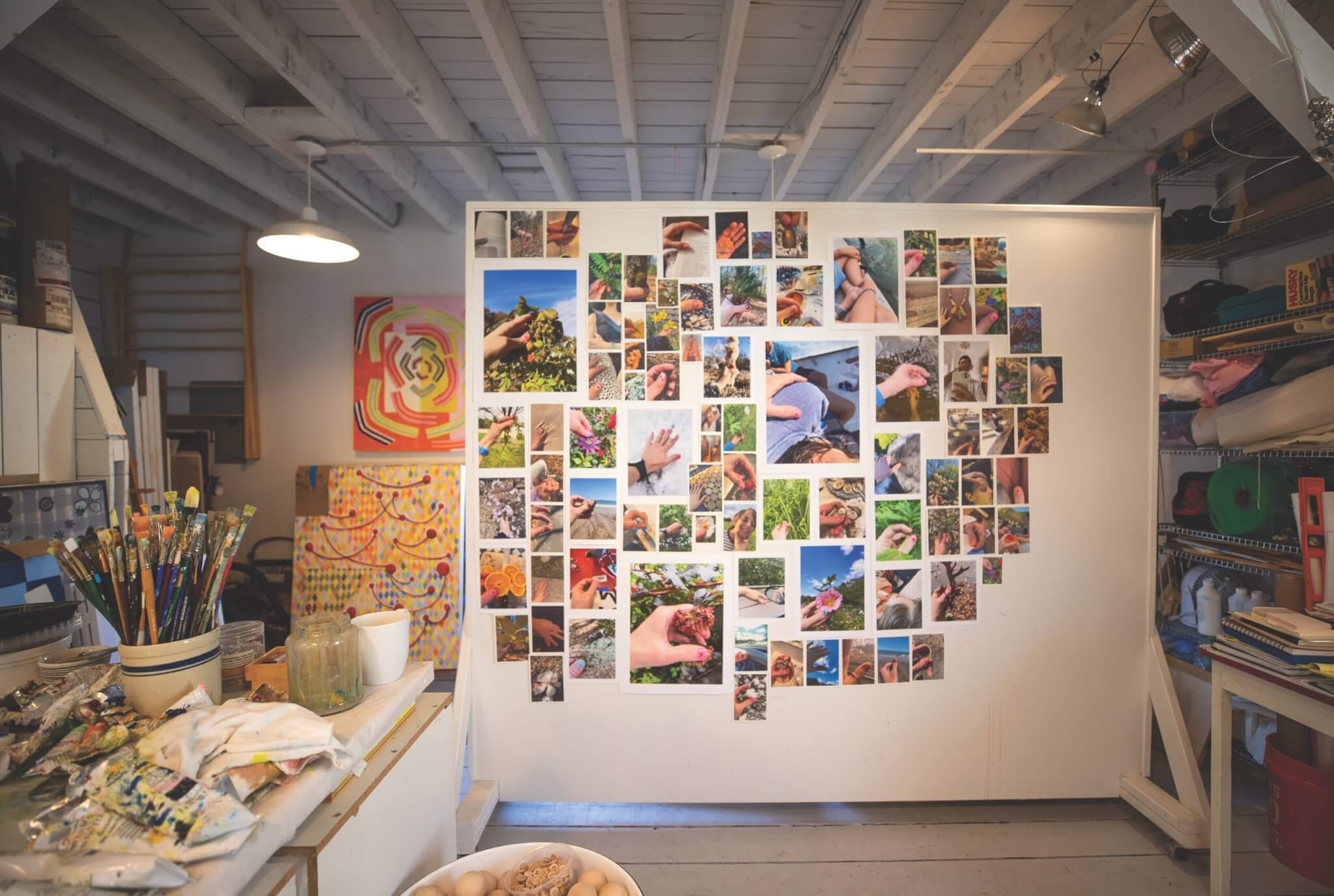 A selection of photos from Crystalle Lacouture’s Eleven Months (Touching the World) series hang in her studio. Photo by Carlie Febo for Boston Art Review.