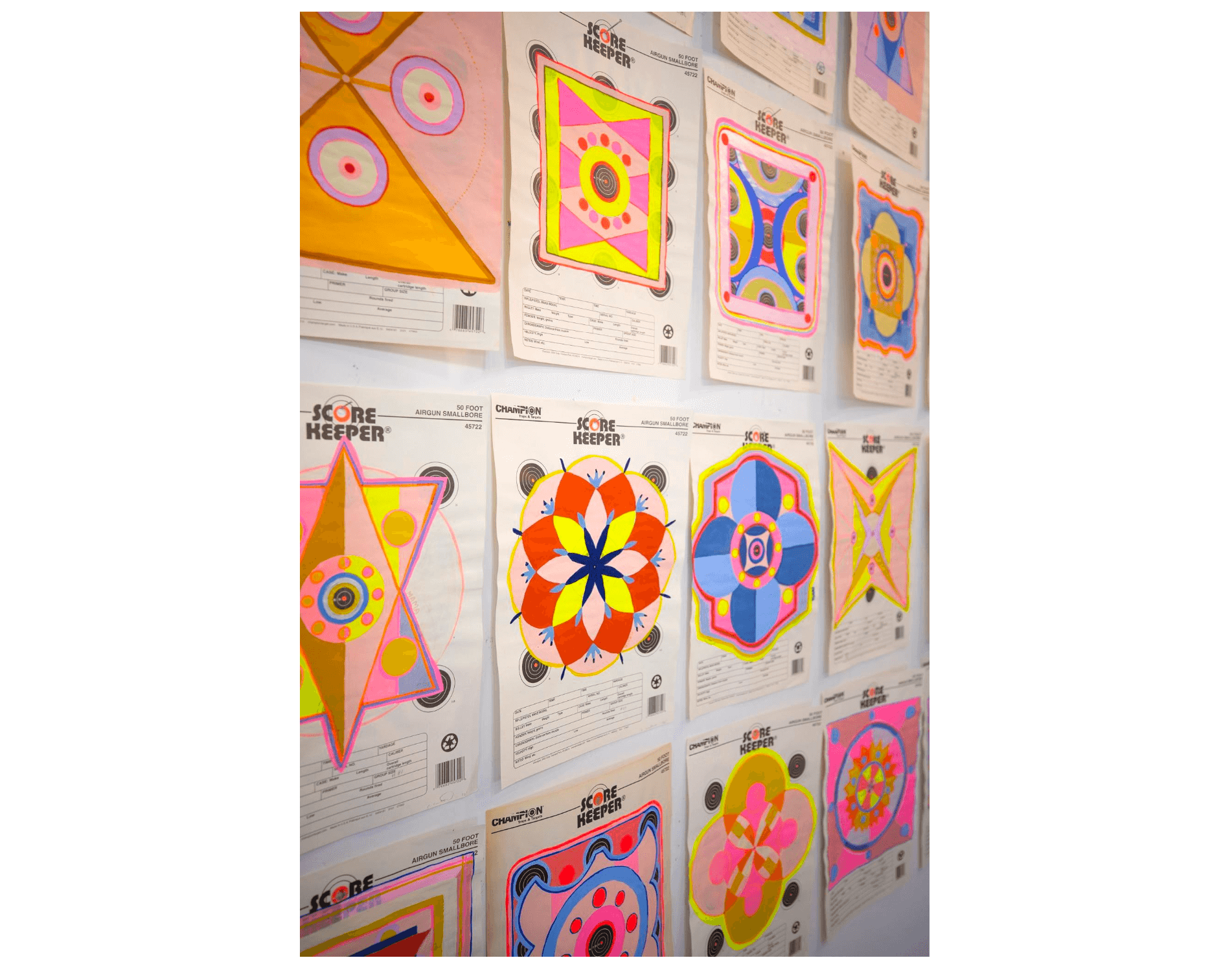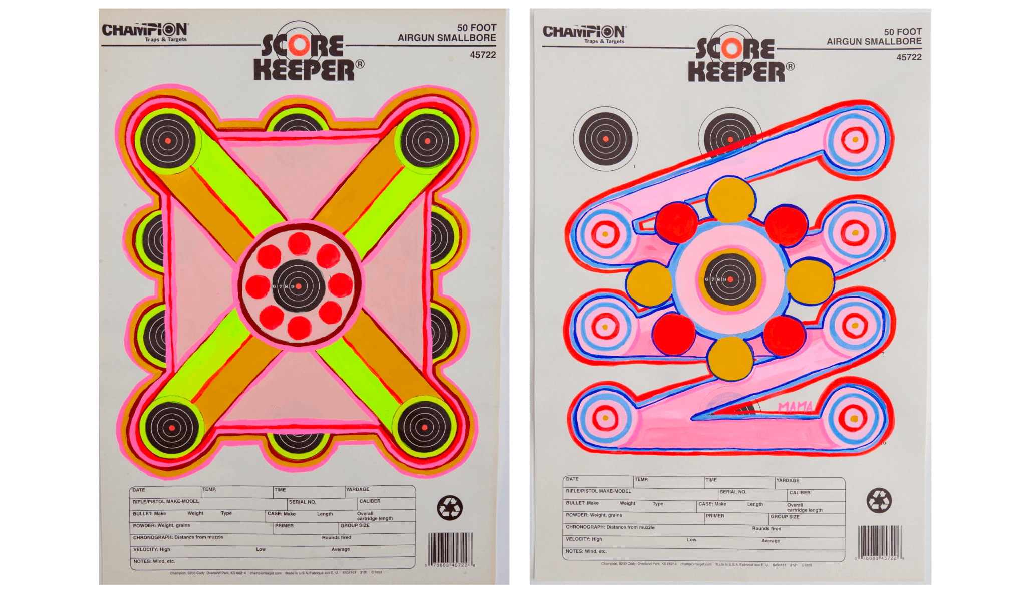 (left) Crystalle Lacouture, MAMA Drawing #56, 2023. Gouache and colored pencil on Score Keeper shooting target. 11″ by 17″. Photo courtesy of the artist. (right) Crystalle Lacouture, MAMA Drawing #61, 2023. Gouache and colored pencil on Score Keeper shooting target. 11″ by 17″. Photo courtesy of the artist.