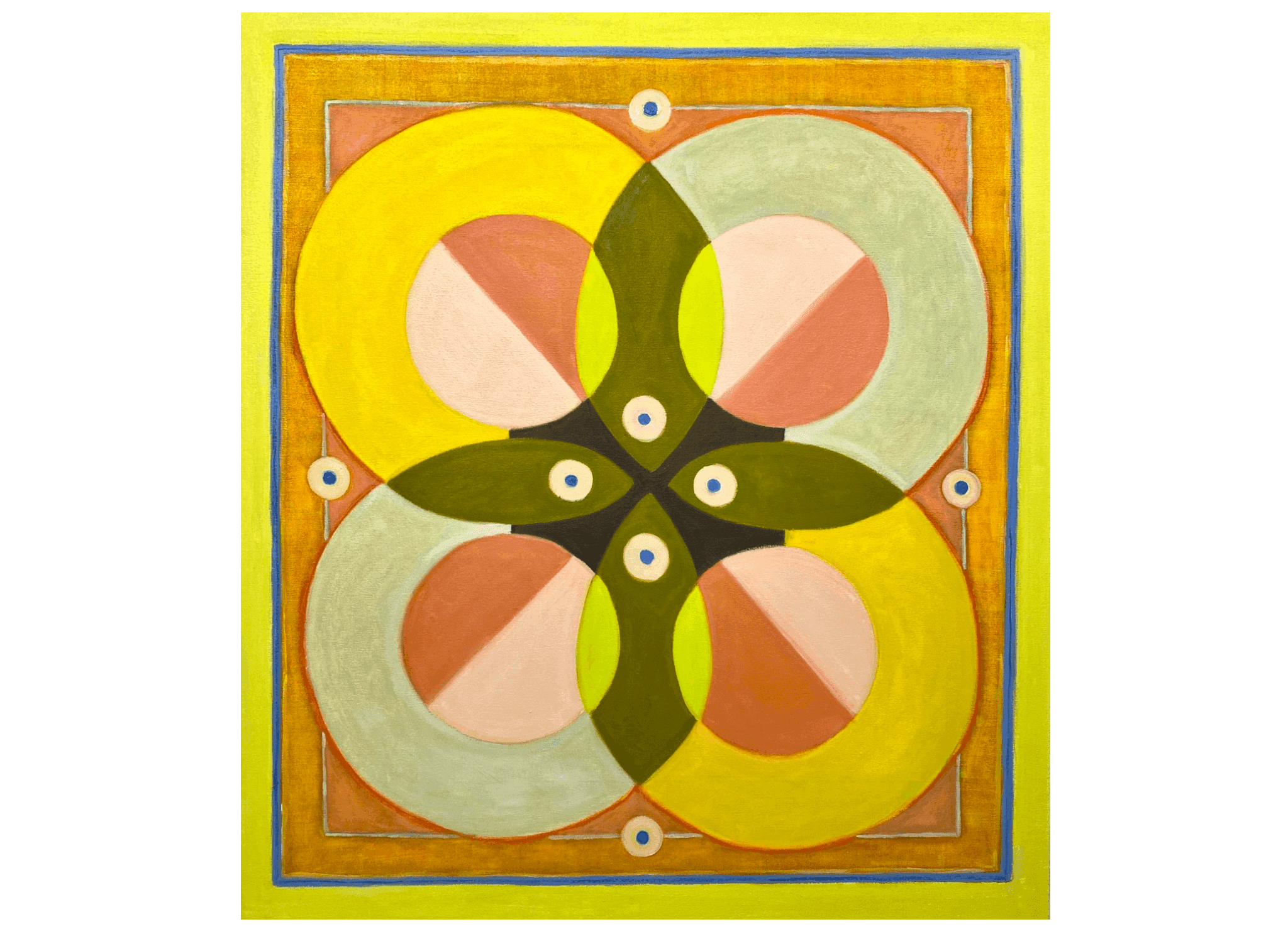 Later, back at her studio, I studied her 40″ by 35″ oil painting Scissors on the Curves (2023) and was struck by the interplay of fresh tonality and archetypal design. The piece is dominated by interlocking rings mapped out in daffodil yellow and pale mint. Within them, pink and salmon circles, their centers bifurcated with angled lines, draw the eye to the center where Lacouture has arranged four ellipses in a murky mossy green, each sporting an unblinking orb—which can’t help but call to mind the evil eye of antiquity. Their pointy ends and daubed dots suggest the fish of Christian iconography or, if you follow them around the contours of their rings, the snakes and eels of more primeval theologies.