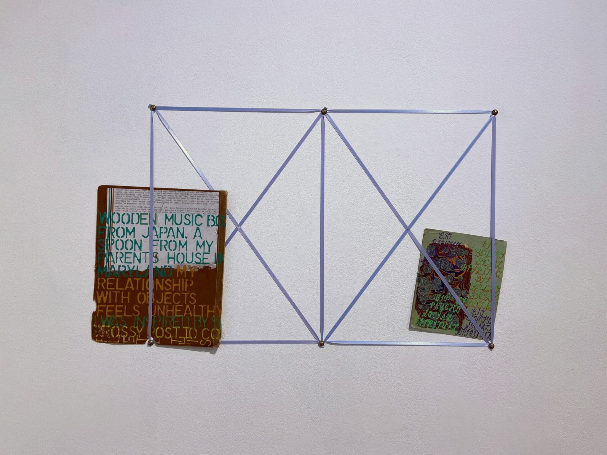 For her solo exhibition at the Brattleboro Museum & Art Center, Brooklyn-based artist and archivist Mitsuko Brooks’s epistles hang from wire or nestle in lattice-like ribbon arrangements suggestive of decorative bulletin boards or letter racks from another age. Tacks and pins hold the ribbons taut. A sign lets you know it’s OK to slide these hardbacked postcards out from behind the ribbon and off the wall to look at both sides, as long as you wear white gloves and return everything to where you found it.
