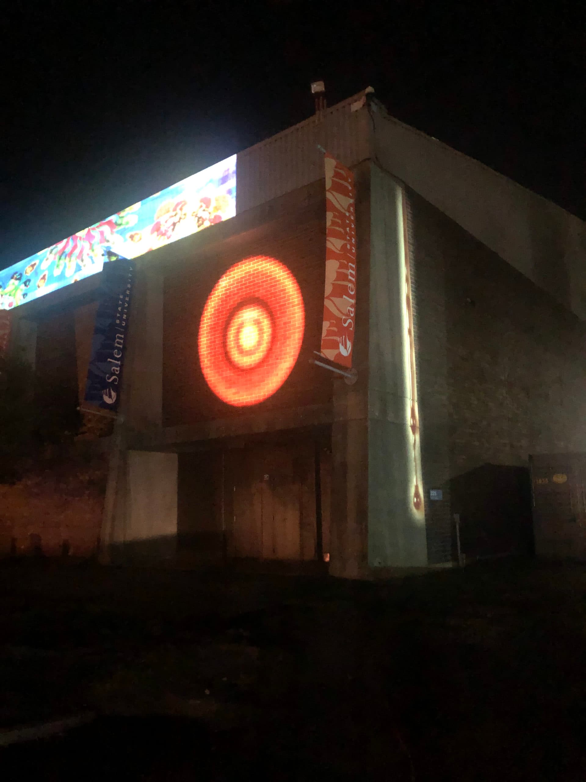 Throughout the night, kaleidoscopic objects, a woman’s silhouette, and large white text along with other projections floated high above the crowd’s cars on a wall to the left of the main screen. Pulse—a circular red video projection by artist Liz Nofziger—throbbed on the wall while the audio pumped through the speakers. “We’ve all been forced [due to the pandemic] in more immediate and less immediate ways to think about our own mortality…and this piece with its kind of irregular pulse,” Nofziger said, “feels related to body…and vulnerability.” Nofziger typically creates site-specific work, but she thought Pulse, previously available for viewing in a gallery on a monitor, was an appropriate piece to revive for the fair.