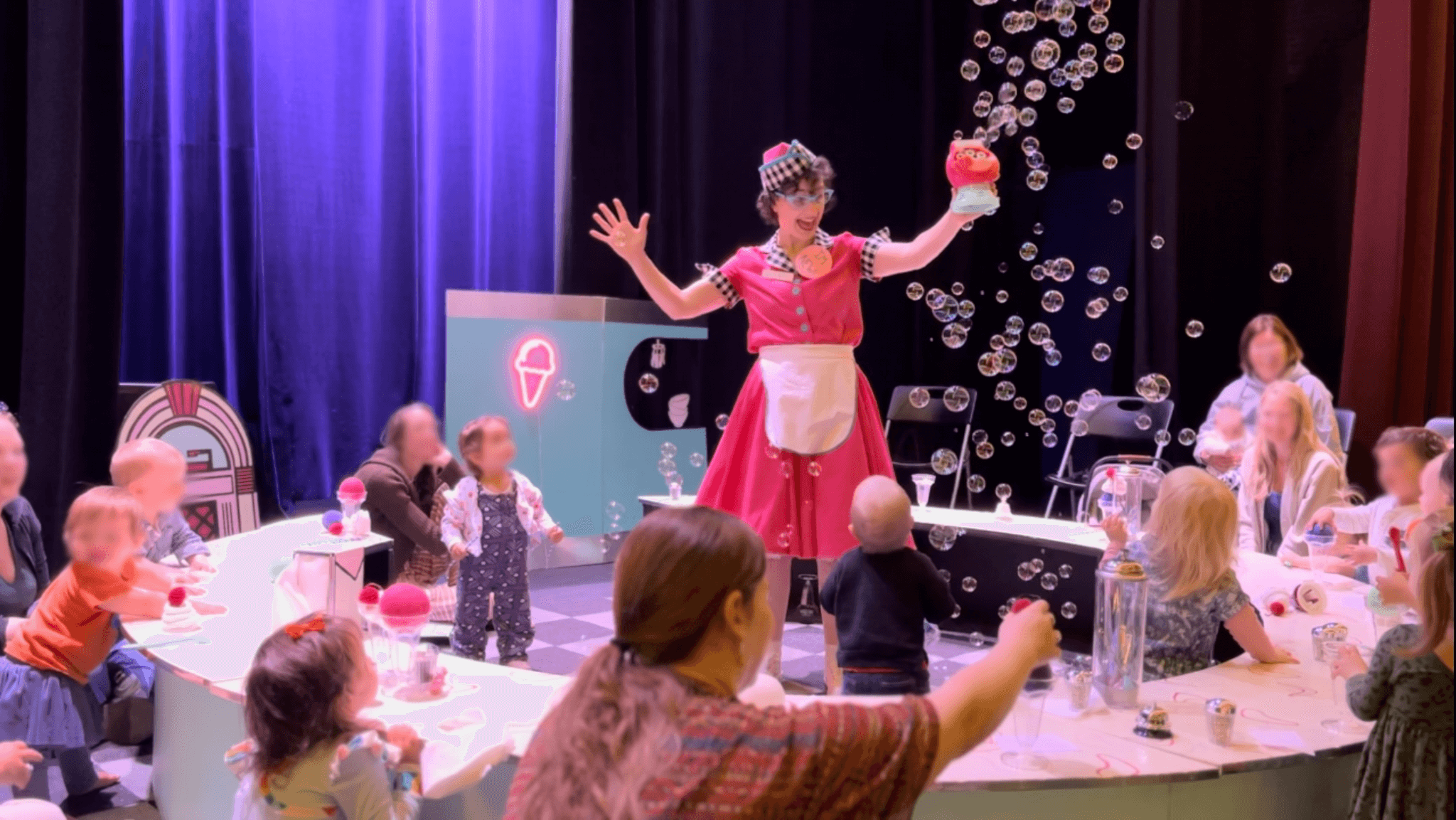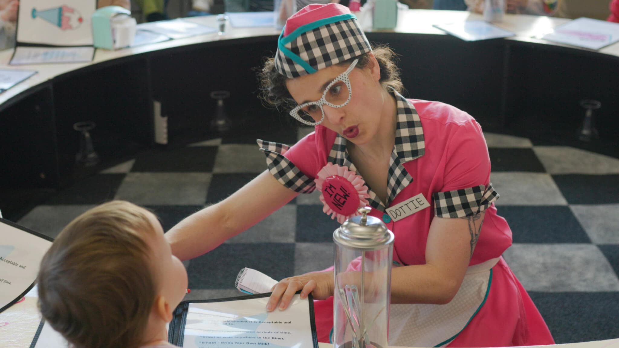 Rogati’s one-woman show Whipped Up! is designed to entertain audiences ages zero to two and their caregivers alike. Over the production’s half-hour running time, a loose plot unspools: It’s Dottie’s first day at the diner, and there are orders to take and serve, frantic phone calls with the boss who’s out sick, a crowd-pleasing finale. But Rogati has a background in devised theater, and much of the action is shaped by the tots who become her improv partners. One toddler who immediately wandered behind the counter earned an “Oh, are you applying for the job too?” and a paper cap to wear. Another repeatedly smacked a shiny call bell and summoned Dottie, who rushed over again and again with a breathless “How can I help you?”