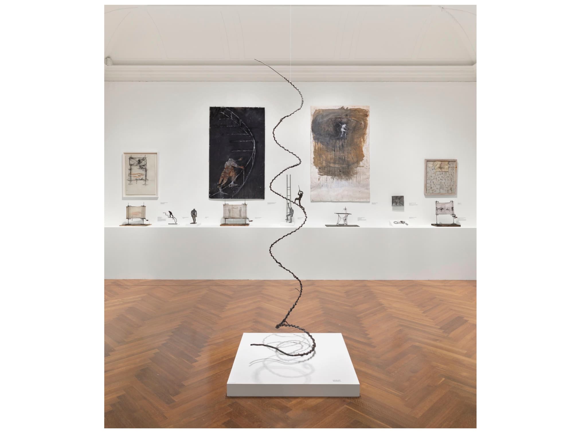 “June Leaf: Shooting from the Heart,” the seismic retrospective on view at the Addison Gallery of American Art, begins subtly. Next to the exhibition’s introductory text and below a quote from the artist, a wiry sculpture of an instrument-bearing tightrope walker sits on a shelf. Titled Figure with a Horn (2023), the sculpture lends its small tin musician a sense of lightness and ease, as if walking on a wire while carrying an instrument twice one’s size could be an effortless experience. Whether this act is physically possible is irrelevant for Leaf. Instead, her work celebrates humans’ attempts to be greater than themselves through technology, performance, relationships, and art. As the artist’s writing, which is foregrounded throughout the exhibition, reveals, Leaf revels in the hilarity that can result in attempting the impossible. There is, of course, always more than meets the eye—whether that be in the case of circus acts, jokes, or artmaking—and “June Leaf: Shooting from the Heart” has a lot to see. With over 150 works across different media by Leaf, curators Allison Kemmerer, Gordon Wilkins, and Sam Adams organized the exhibition in a way that echoes the artist’s oeuvre: expansive, overwhelming, and, above all, captivating.