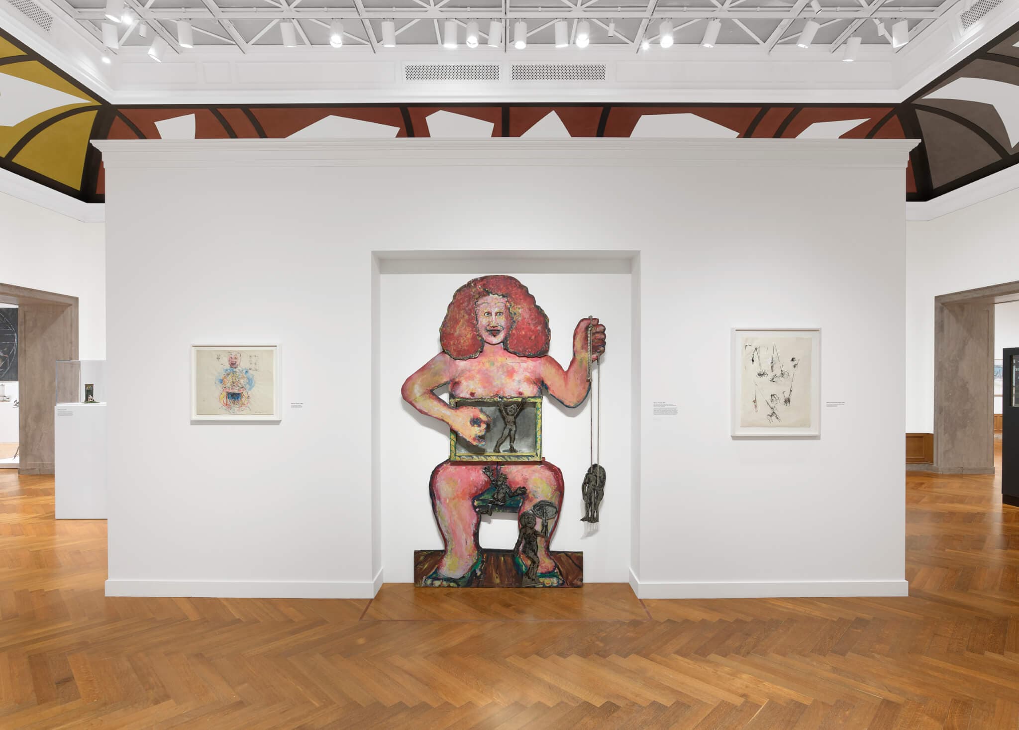 Clear associations like this are frequent in “Shooting from the Heart,” and their connections extend throughout the galleries even when the subject matter is not identical. When one reaches the end of the exhibition, where many of the works focus on couples, the woman and man in Untitled (Theater) and Untitled (Hand) might come to mind. Leaf depicts her own hands in a moving drawing of Frank from 1979, allowing the viewer to see the scene from her perspective. The artist penned the reflection “I would like to make a movie with Robert” across her left knuckles and “It is impossible to do the same story every day” across her right. The latter statement’s mention of what is not possible might initially sound negative, but in the context of Leaf’s work, it is affirming. No matter how many times Leaf repeated the same motif, scene, or theme in painting, drawing, sculpture, or some combination thereof, each repetition resulted in something simultaneously unique and multidimensional. In the drawing of Frank, he is both the subject of Leaf’s desire and the subject of this artwork. This duality emphasizes her position as an artist to the viewer but also welcomes the viewer to identify their own links between subject matter across Leaf’s carnivalesque oeuvre. Indeed, it is hard to resist going through the exhibition several times to discover more of the connections offered by Leaf that the curators have so thoughtfully arranged. The strength of “Shooting from the Heart” is that—to borrow from Leaf’s words—it is impossible to see the same story every time.