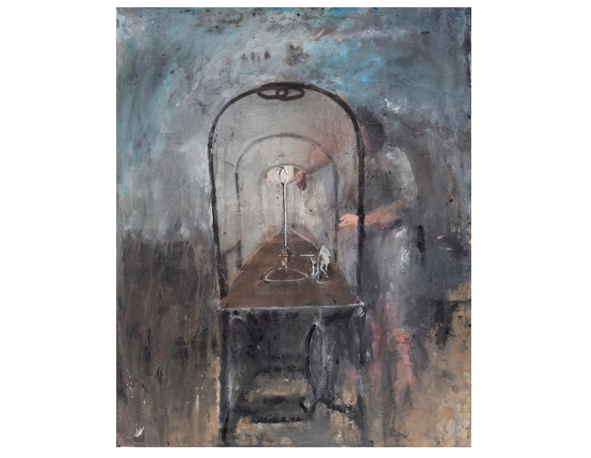In a gallery featuring a group of impactful sculptures made from a range of unconventional materials, visitors will encounter exquisite two-dimensional works that depict pieces, figures, or imagery from the three-dimensional works on view. Untitled (Theater) (2010–2011), for example, is a mixed-media sculpture whose base is composed of an antique Singer sewing machine table with a manual foot pedal. A theater-like dome sits atop the base and houses a small metal figure seated nervously by a large contraption attached to gears and a crank. The dadaist absurdity of the sculpture is clear, which is why Leaf’s quip in the label is especially welcome: “The answer to your question, ‘what is the meaning of this machine?’ It is that this little man is endlessly cranking the machine to create light…but he needs help.” Leaf’s wry humor here—toward her viewer and the “little man”—is more affectionate than cold. Hanging next to Untitled (Theater) is the painting Untitled (Hand) (2011), which depicts the sculpture accompanied by a life-size figure (perhaps representing Leaf) lending a hand to the Sisyphean man inside the dome. The pairing of these works not only elucidates the negotiation of labor, care, and desire that permeates most of Leaf’s work, but also the negotiation between artistic media. Although the sculpture has a much larger presence than the painting, the painting powerfully punctuates the sculpture.