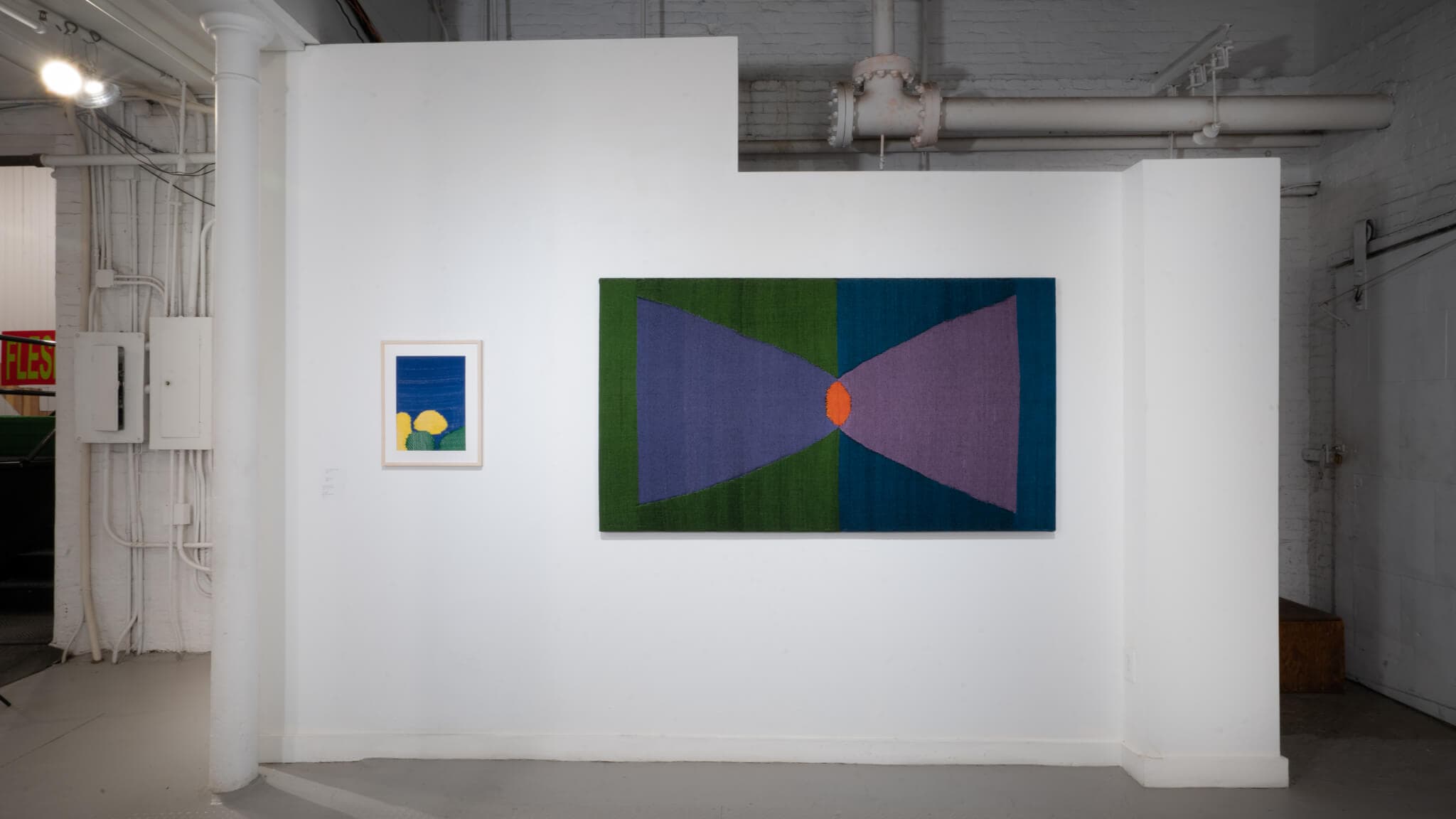 Back to the body. Woven material reverberates with its sensitive making—hooks piercing, tugging, creating wrinkles and crevices. By integrating metal hardware in many of the textile pieces, Cote reflects tension between body and infrastructure, the forces that hold us together and stretch us into dynamic, sometimes unnatural, forms and flows. In KNEE 2 KNEE, cotton yarn paints two purple mountains; their tips touch and gleam bright orange. Despite the title, I think about nipples, a site of both pleasure and politics. I think of their tenderness, material chafing over them, metal piercing through. Nipples are also a site of identity specification, restriction, and censorship based on who you are. The personal and the political bleed together as the show signals.
