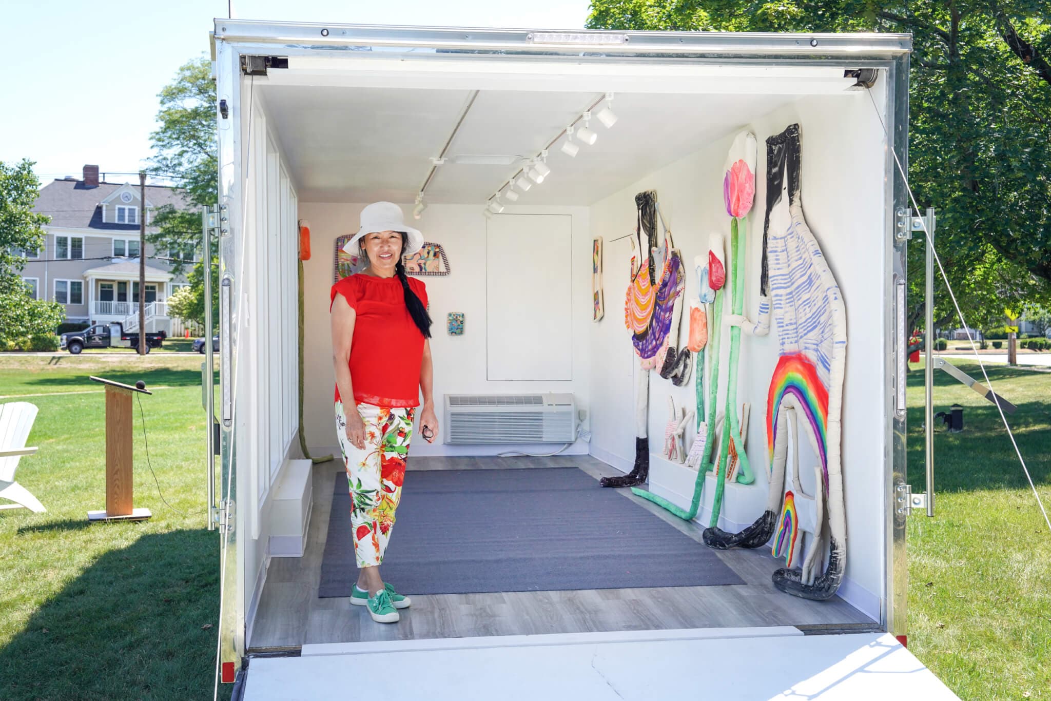 “At the time I was in a business class at MassArt, but I was also pregnant, and it ended up becoming too much, so I tabled the idea,” LeComte Lecce recalls. But then last year, with her son in a stroller beside her, she pitched the concept to Melisa Tintocalis, the economic development director for the town of Burlington, which had earmarked funds for a placemaking grant. Now, after transforming the trailer—and finally finding a solar company to work with after thirty rejections—the Burlington Micro Gallery has launched with “Loose Ends,” a show of Jai Hart’s shaped and stuffed paintings, on view through August 29. “They’re very vibrant and playful,” LeComte Lecce says. “And Jai herself is incredibly kind and just so talented. She lives nearby in Concord, and my goal is to highlight Massachusetts-based artists with this space, at least for the next year.”