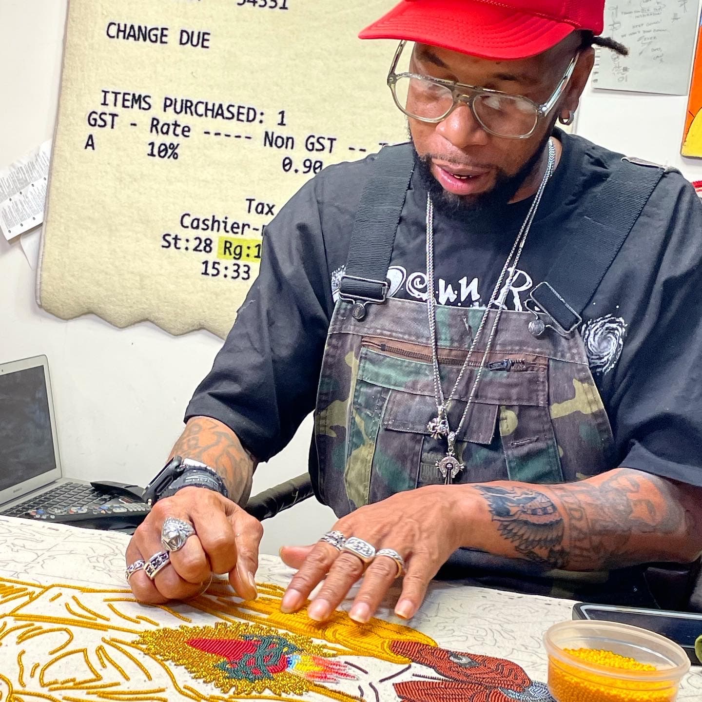 Big Chief Demond Melancon beading in his studio.