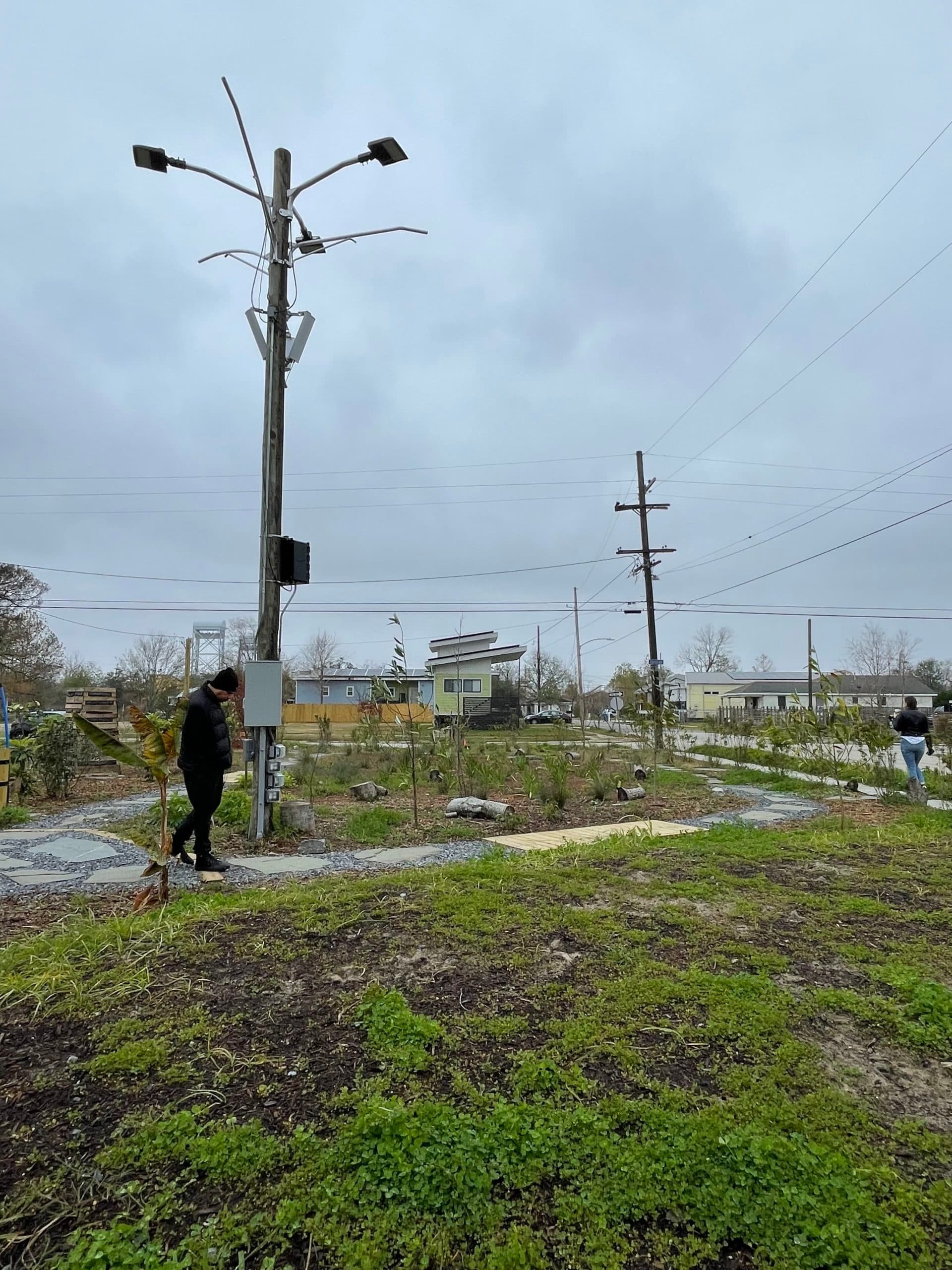 Nial takes in Kevin Beasley’s installation at 1741 Forstall Street in the Lower Ninth Ward. A “Brad Pitt” house is in the background.