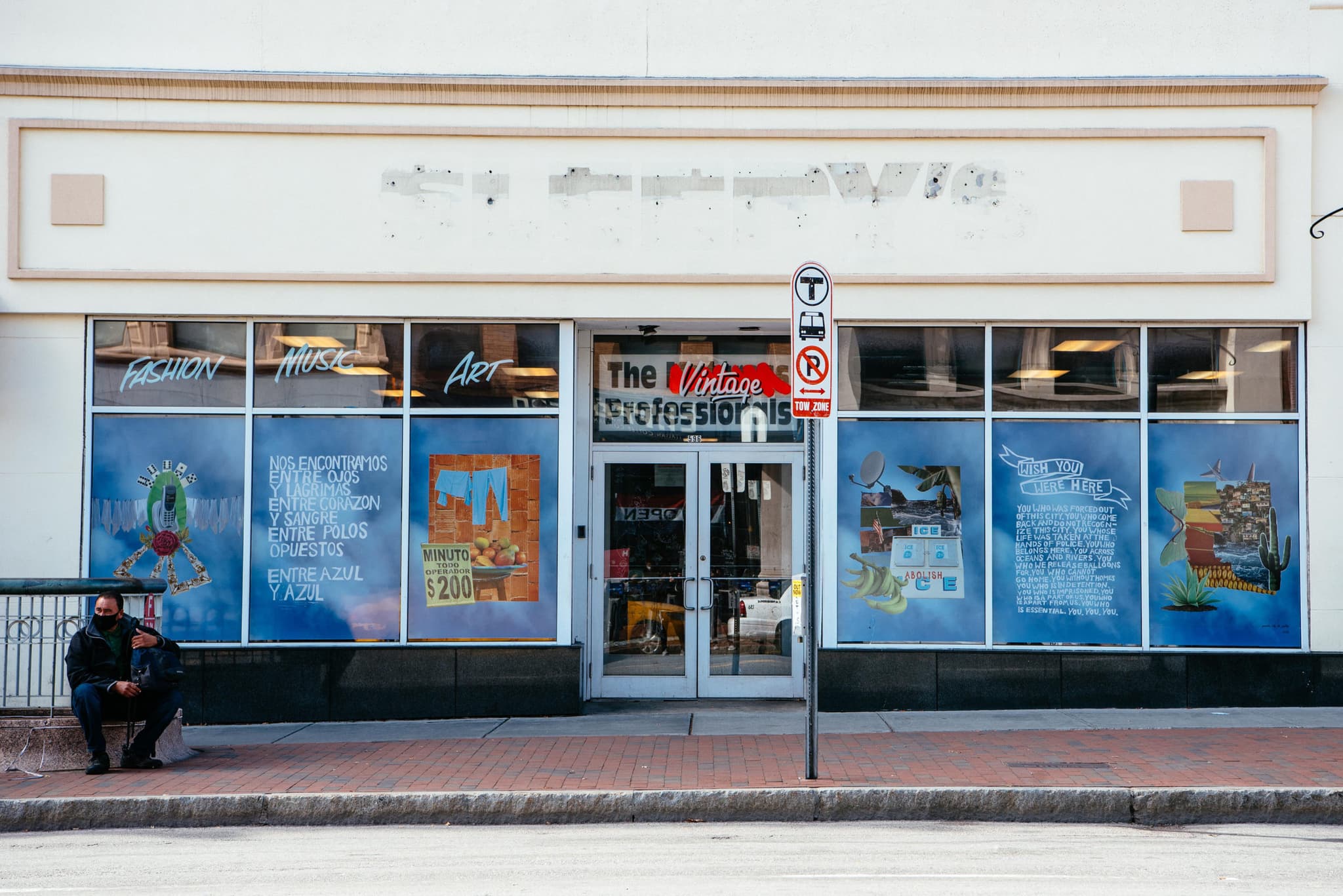 Entre Azúl y Azúl (Between Blues) incorporates images representing the Caribbean, Latin American, and African immigrants that filled Central Square’s streets. Created for and displayed in windows at 596 Mass Ave in Cambridge, de la Calle’s artwork tackles the issues of displacement and the rising financial barriers of access for the communities that call—or once called—the neighborhood home.