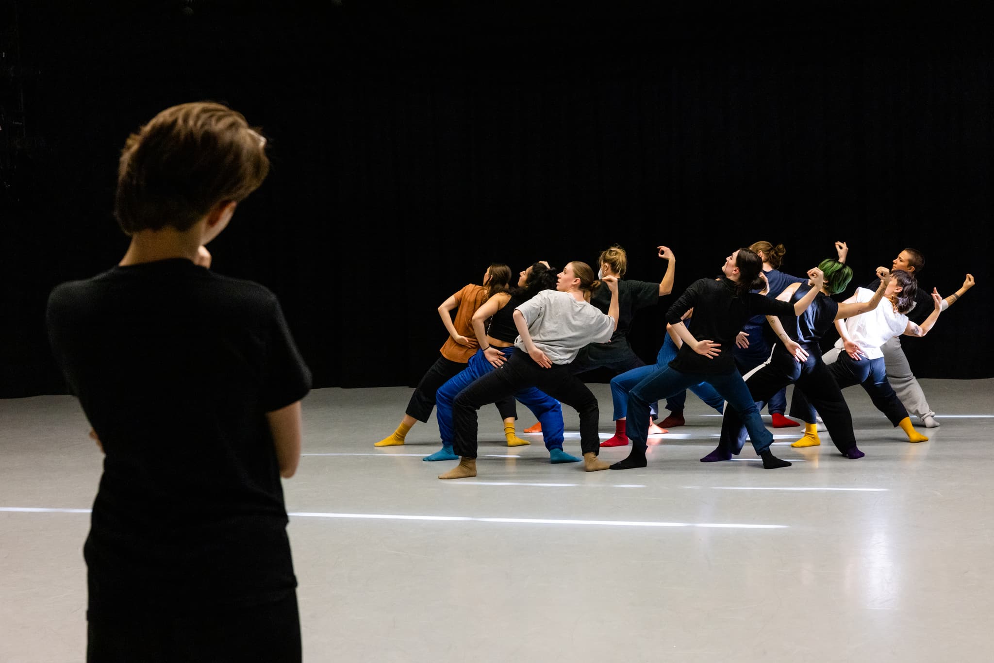Jessi Stegall and dancers rehearsing The Theremin Vignettes. Foreground: Jessi Stegall. Background: (left to right) Hannah Franz, Aliza Franz, Heather Easley, Elizabeth Epsen, Dara Capley, Henry Winslow, Raxel Kempenaar, Andrea Muniz, Hannah Ranco. Photo by Melissa Blackall.