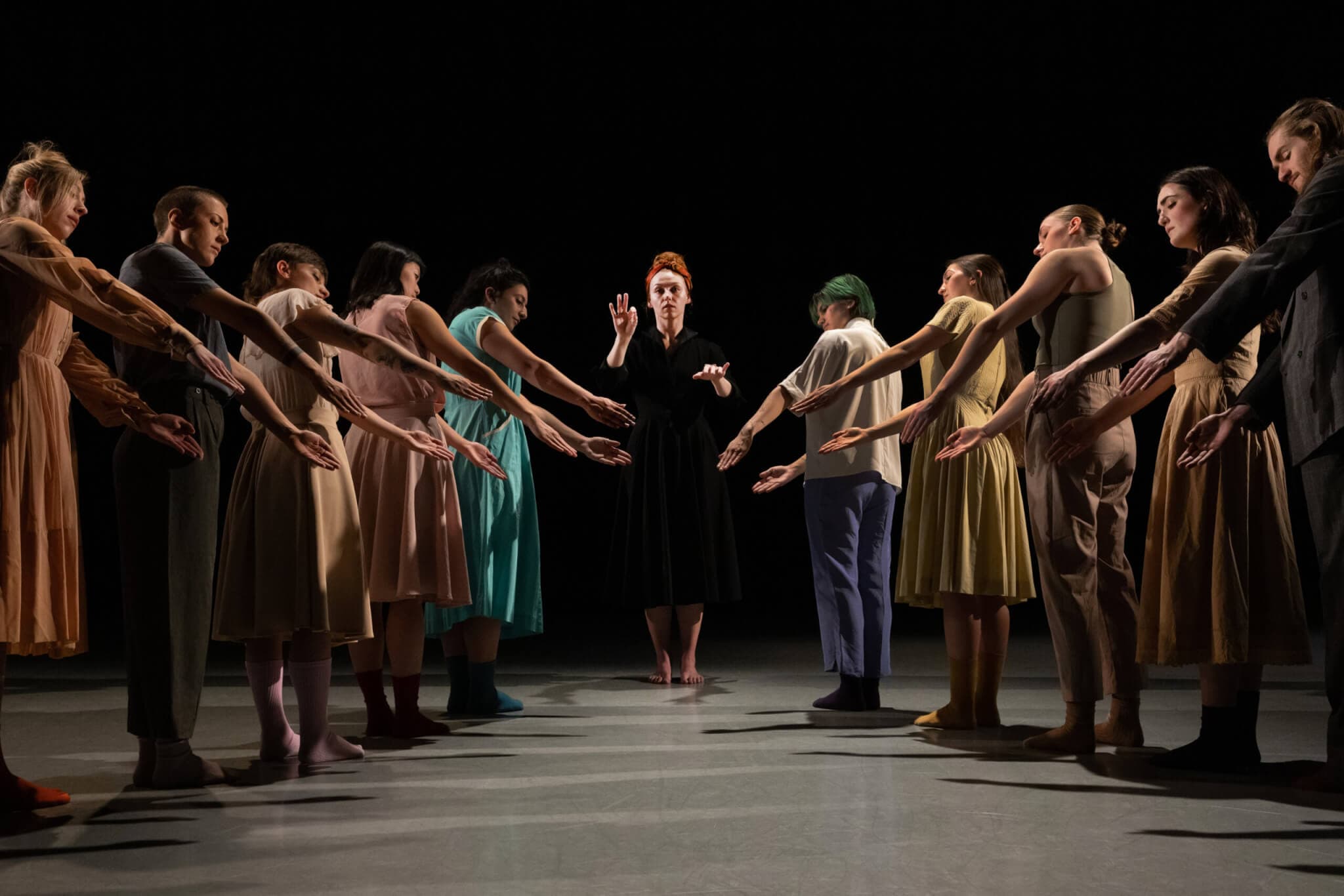 The Theremin Vignettes by Jessi Stegall, performed at the Boston Center for the Arts in May 2023. (left to right) Elizabeth Epsen, Hannah Ranco, Andrea Muniz, Cassie Wang, Aliza Franz, Haley Andrews, Raxel Kempenaar, Hannah Franz, Heather Easley, Dara Capley, Henry Winslow. Photo by Melissa Blackall.