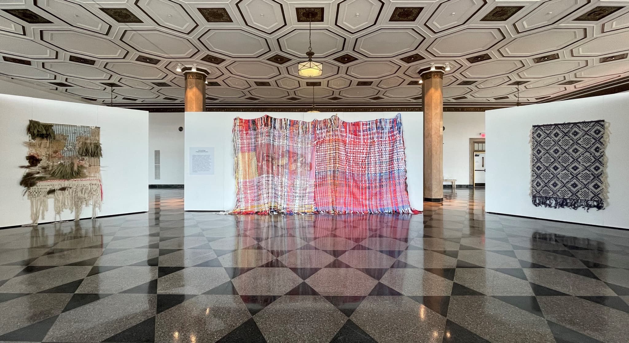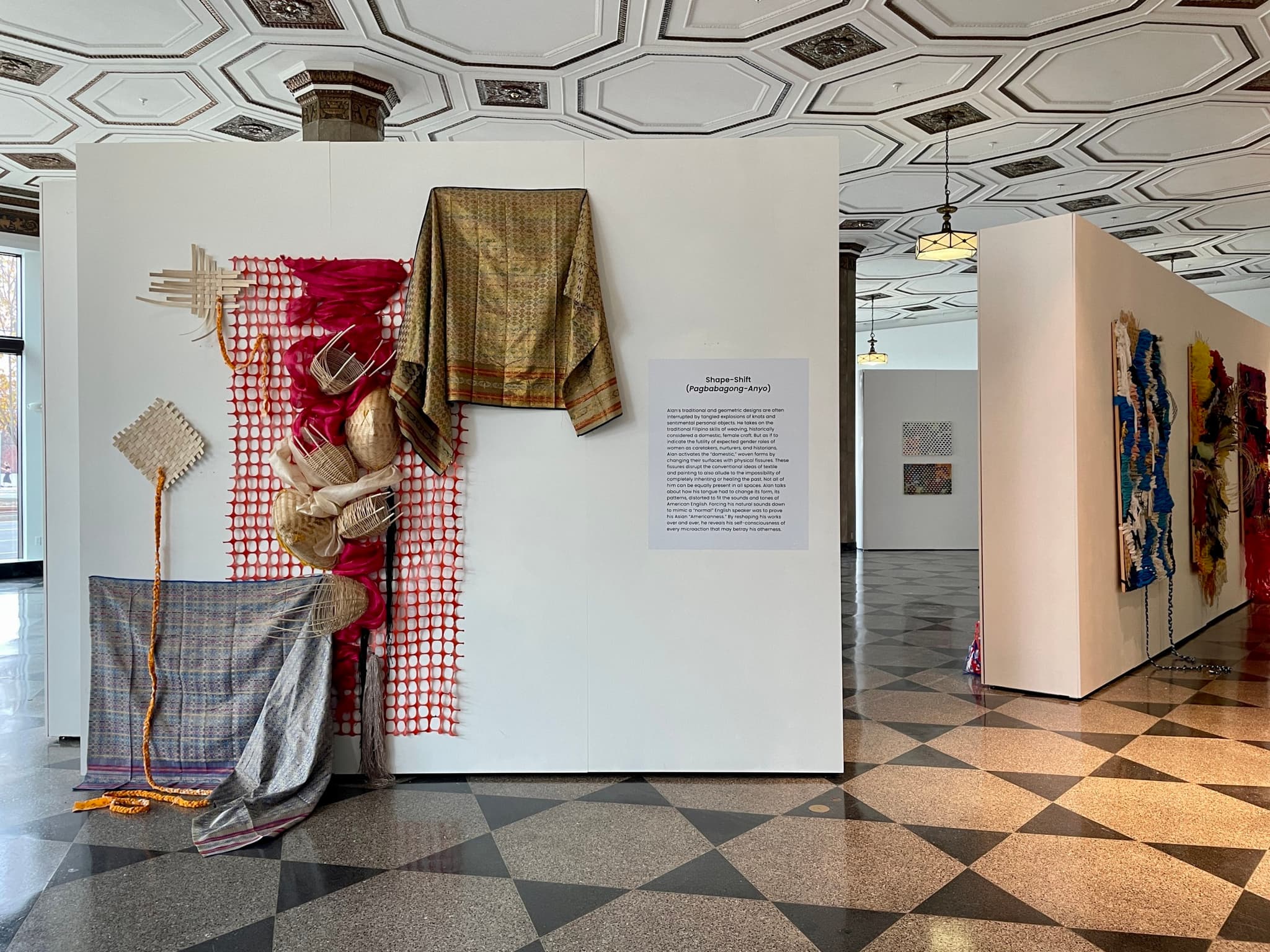Installation view of “Tago ng Tago (Hidden and Hiding),” on view at Boston University’s 808 Gallery November 3–December 1, 2022. Alan has activated the center weaving, Diasporic Threads (2021–2022), in multiple performances. Photo by Jessica Shearer.