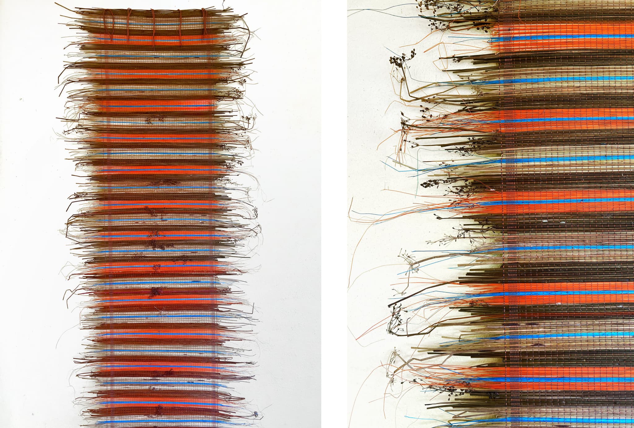 Alan is learning traditional Filipino weaving practices as part of his Fulbright scholarship. His new works (left: untitled woven baníg; right: detail) make use of those techniques and showcase the natural fibers of the region. Photos courtesy of the artist.