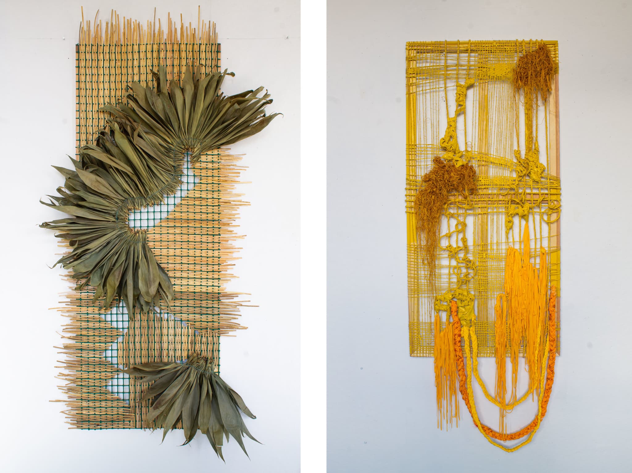 Left: Bhen Alan, Tinikling, 2022. Rattan, bamboo leaves, and industrial fence on stretcher bar. 80″ x 40″. Right: Bhen Alan, Singkil, 2022. Twine, fabric, yarn, thread, and paint on stretcher bar. 62″ x 23″. Photos courtesy of the artist.