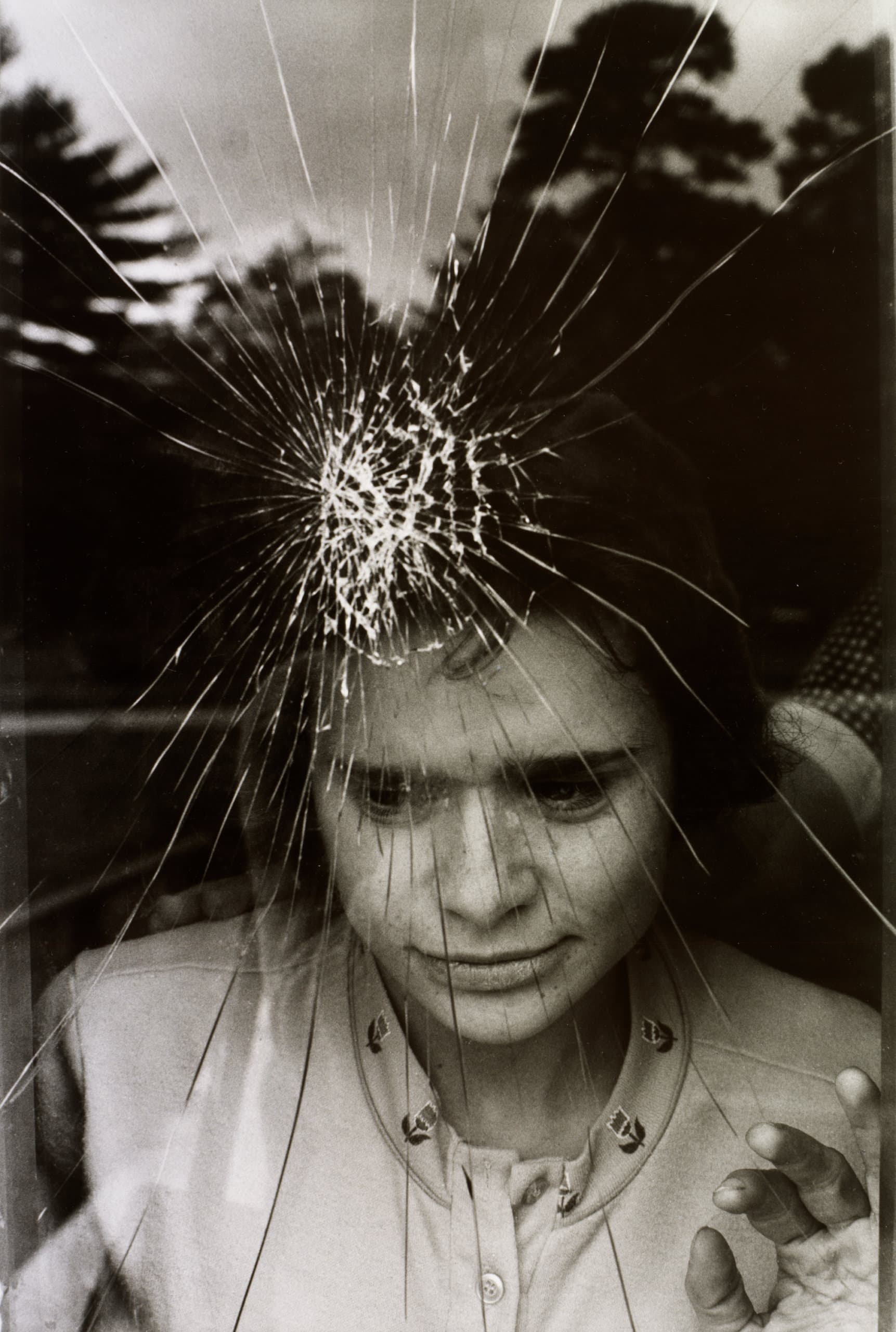 Other works are removed from the artists themselves, and these range from Paul Strand’s morally ambiguous street photography to a stunning Goya etching of, as the curator describes, “a stately little person.” The exhibit’s oldest piece, from 1735, is William Hogarth’s didactic depiction of London’s Bethlehem Hospital, the institution from which the word bedlam derives. Photographer Salvatore Mancini is represented by two photographs from the Ladd School in Exeter, Rhode Island, a state-run institution where patients suffered decades of abuse and neglect before the hospital finally closed in 1994. In one photograph a pensive-looking child stares gloomily out a window that has been violently broken, the spidering glass fragmenting the girl’s despondent face. Michael Mazur’s adjacent lithographs terrifyingly render conditions at a Cranston, Rhode Island facility originally called the State Asylum for the Insane and Poor. Mental disabilities are one reason people ended up in these cruel state-run institutions; others included poverty, debt, a lack of familiarity with English, homelessness, or even pregnancy out of wedlock. Nearly anyone, in other words, could be affected.