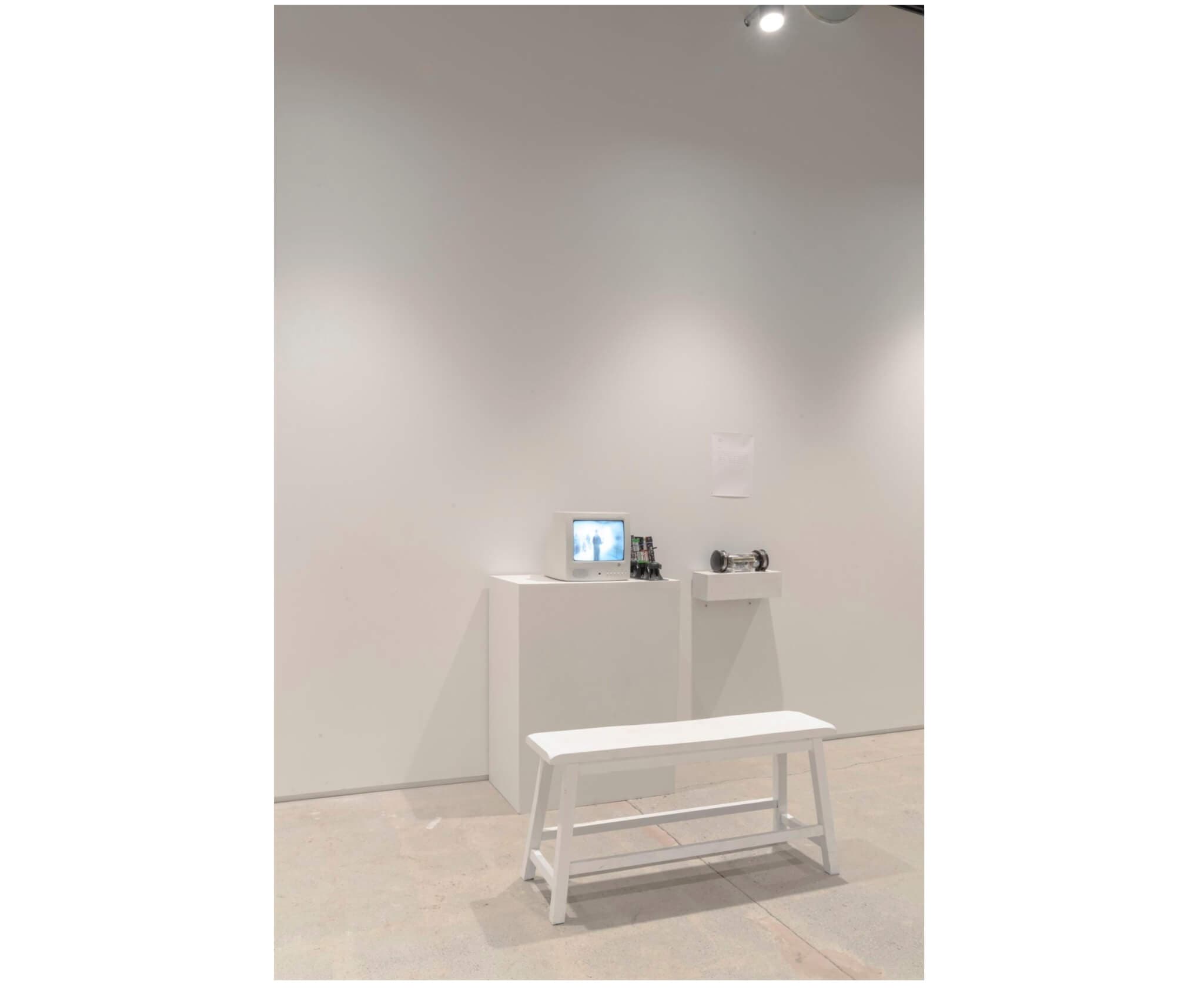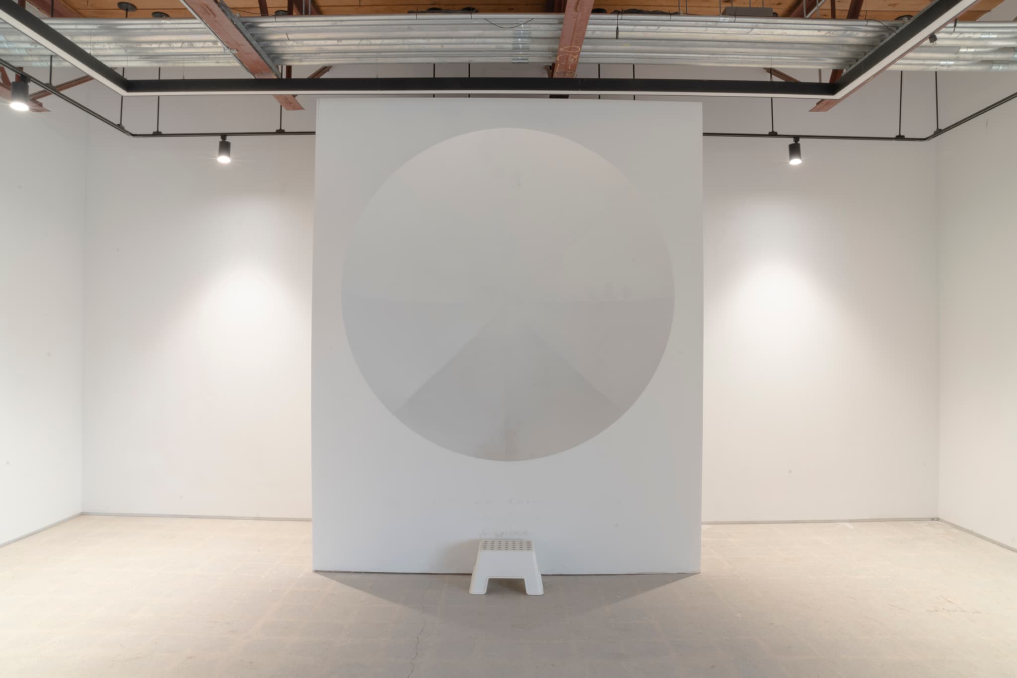 Grand, twelve-foot tall whisper mirrors form the shape of domes on opposite ends of the largest gallery so that everyone between the mirrors has the potential to activate the refraction of sounds therein. Like much of the works on view, the sound mirrors refer to previous iterations. The day the exhibition opened, Harvey IV described the exhibition design and the philosophy in a social media post: “We are using historical military acoustic defense structures as soft power, transforming them into civic instruments of attention and collective resonance.” Harvey IV and collaborators created the whisper mirrors from the same material as museum pedestals, offering an architectural way to enliven or transform often-mute tools of display. The sound mirrors reflect sound and amplify it based on how each subject moves.