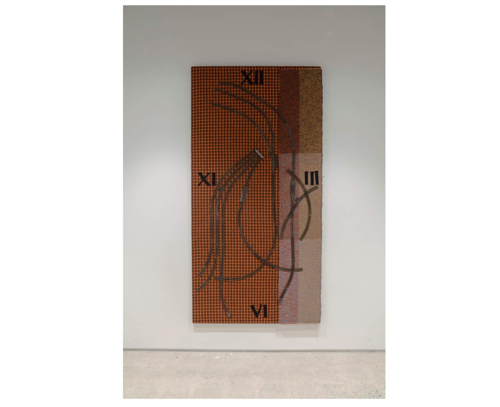 Silverman’s Path of Resplendent Intelligence (2025) has a surface of colorful acoustic dampening textile panels. Four Roman numerals arranged in each quadrant of the collage to refer to a clock, but all of the other lines made by miniature train tracks are neither linear nor radial. They curve like plans well-laid, visualizing intentions to measure that branched off into more intriguing directions.