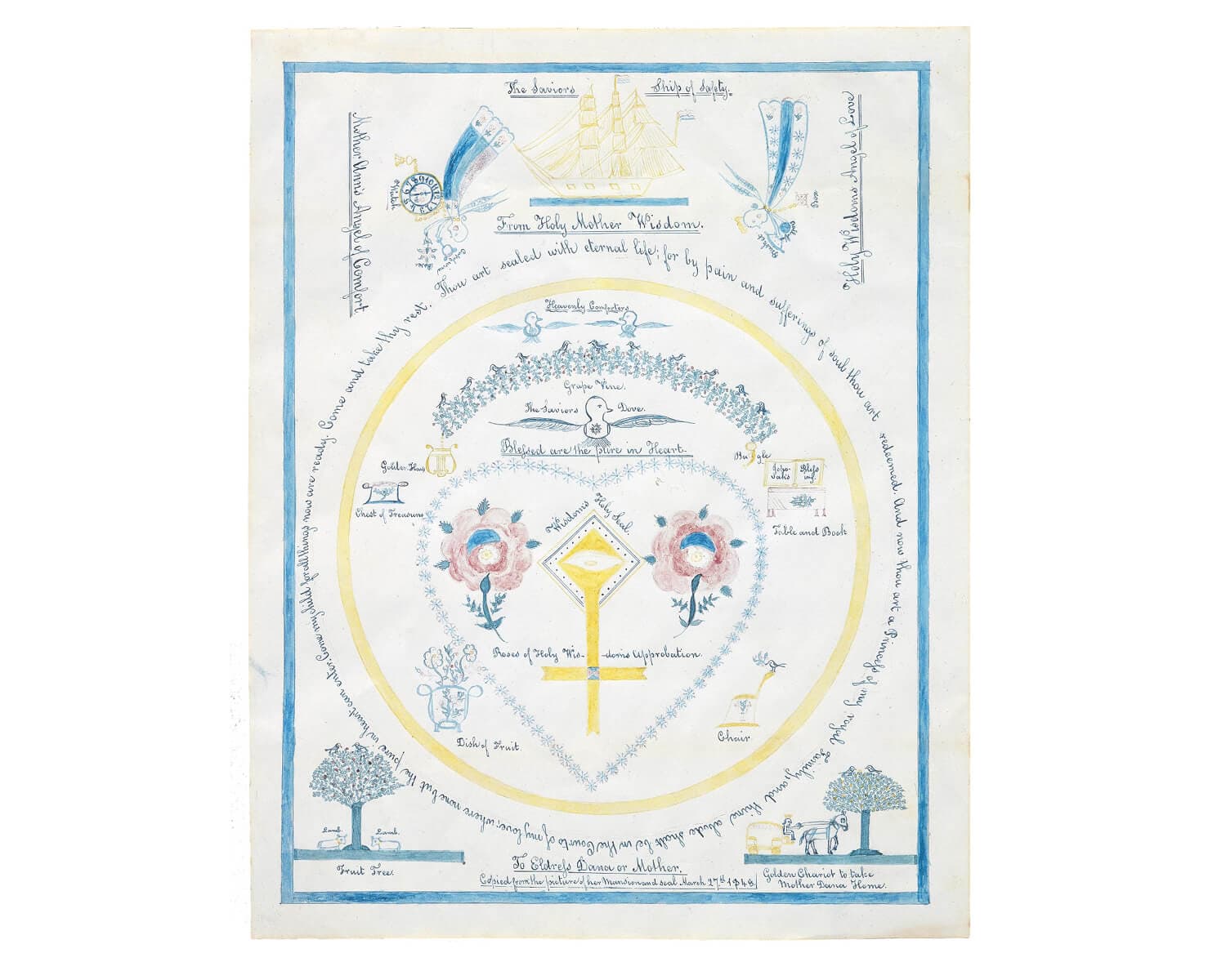 Still the Shaker method fosters the capacity to exist on multiple celestial planes while remaining present, and exceptionally productive, on earth. The Shakers so refined the binary that limiting dualities collapse into themselves. From architecture to dancing patterns, their symmetrical design reinforces mirrored relationships between here and there, male and female, self and community, heaven and earth, labor and worship, mundane and divine, life and death. Each dichotomy sits, not so much separated as co-confronting, locking eyes with a vast, unifying Divine. This transcendence was never made more vibrantly apparent through explicit records and depictions than during the Era of Manifestations (EOM), from roughly 1837 to 1857. This period was also called “Mother’s Work” due to the unprecedented nature of revelations delivered to the Shakers by their late leader, Mother Ann Lee. The EOM, as unique within Shaker history as the Shakers are within American history, punctuates an under emphasized cornerstone of their spirituality: communication with the other side.