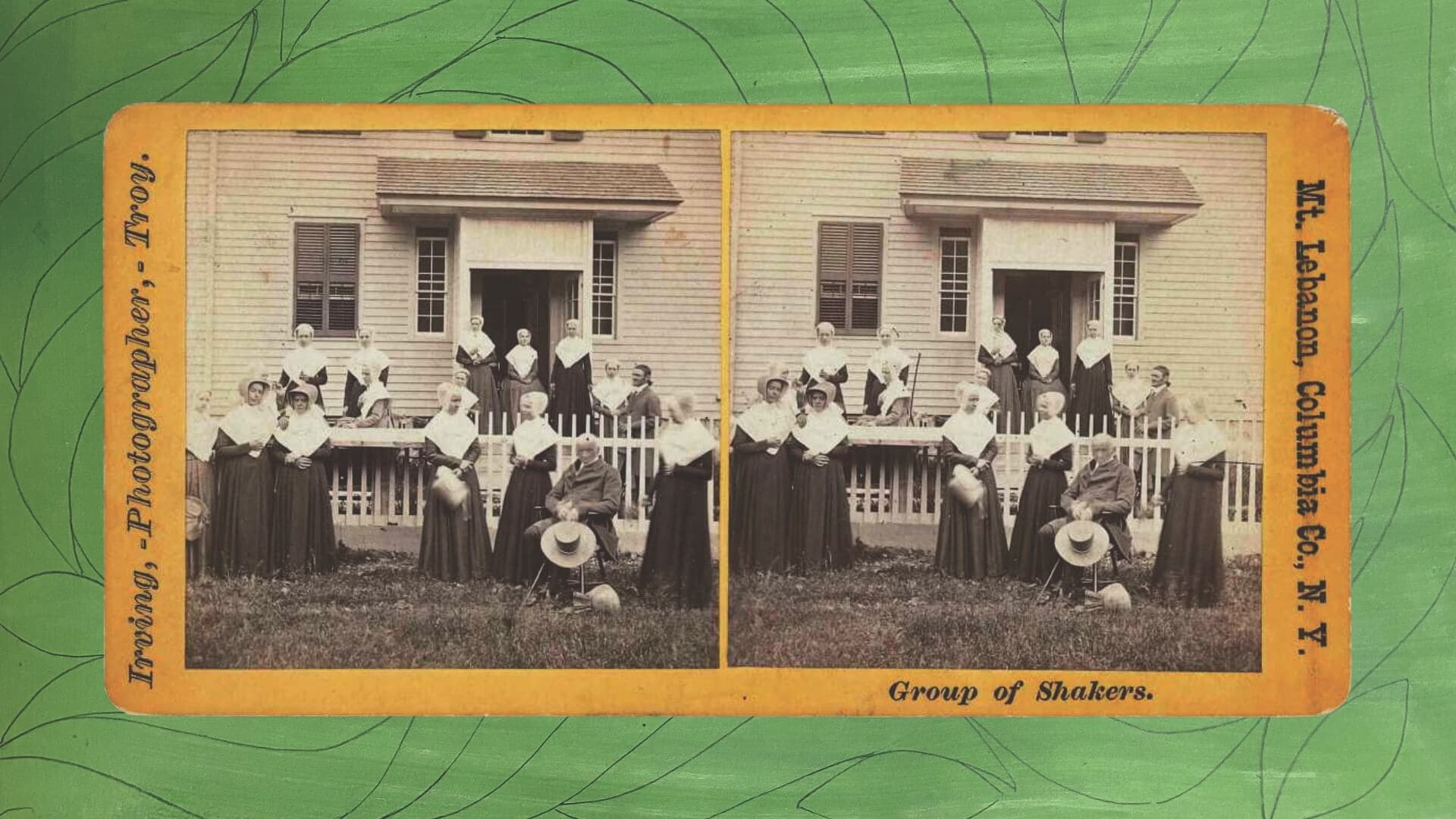 James Irving stereograph from circa 1871 featuring members of the Mount Lebanon North Family posed in front of the sisters’ entrance of the First Dwelling. Courtesy of Maria Molteni.