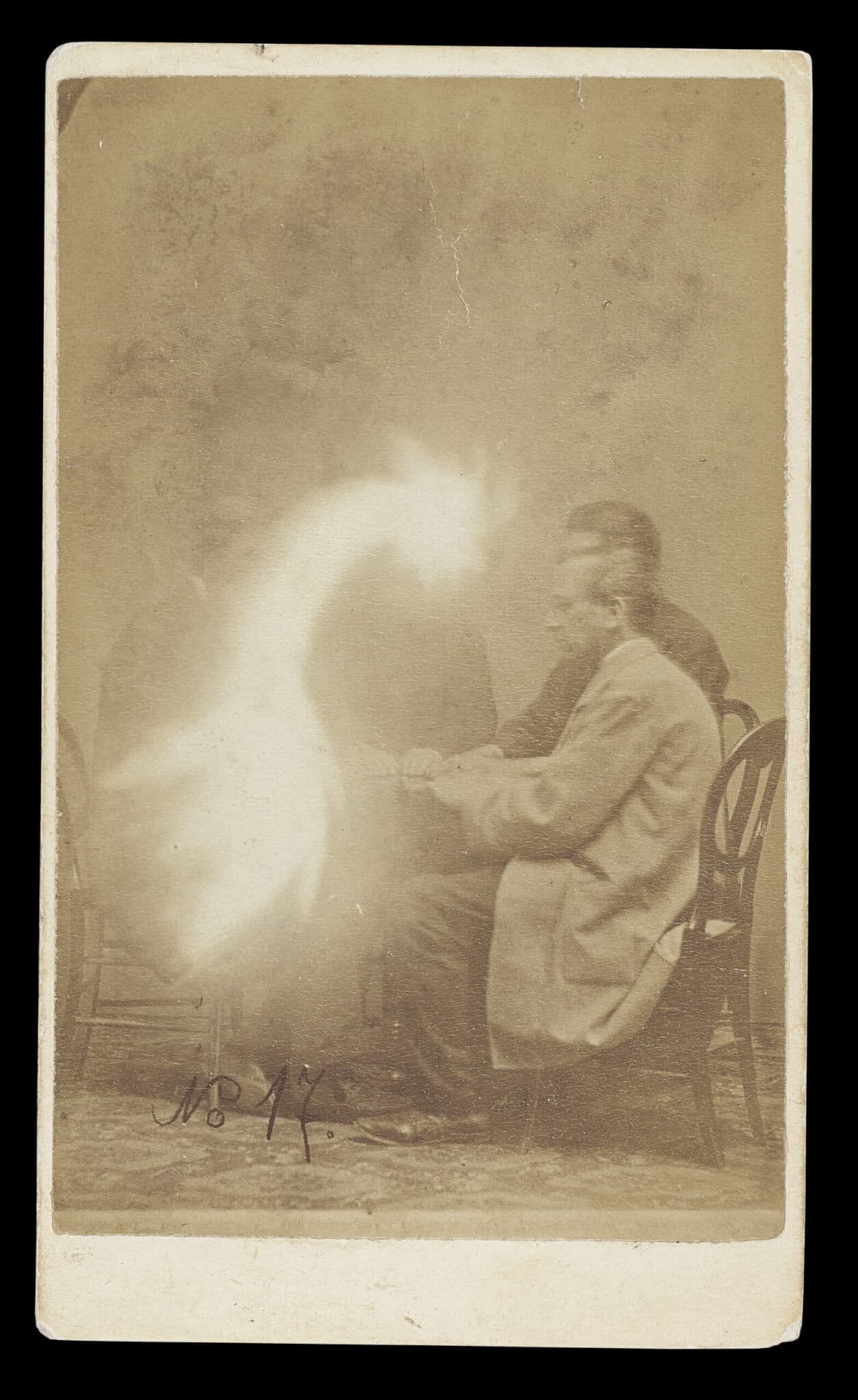 William H. Mumler, Photograph of Mrs. Lincoln with spirit of Abraham Lincoln and Son, 1872. Albumen print. Collection of Tony Oursler. Photo courtesy of Oursler Studio and Peabody Essex Museum.
