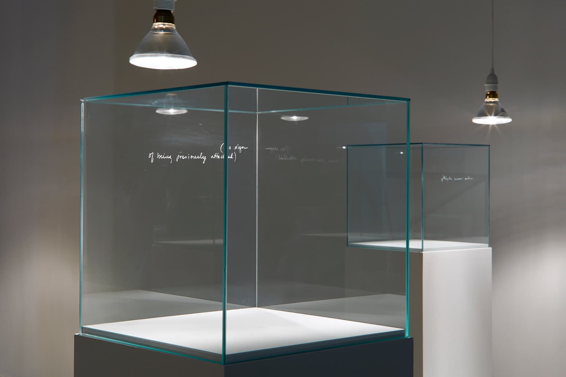 Elisabeth Subrin, “Damage Report,” installation view, ICA Philadelphia, 2014. Front left object: No Sign of Being Previously Attached, 2014. Etched glass vitrine. Photo courtesy of the artist.