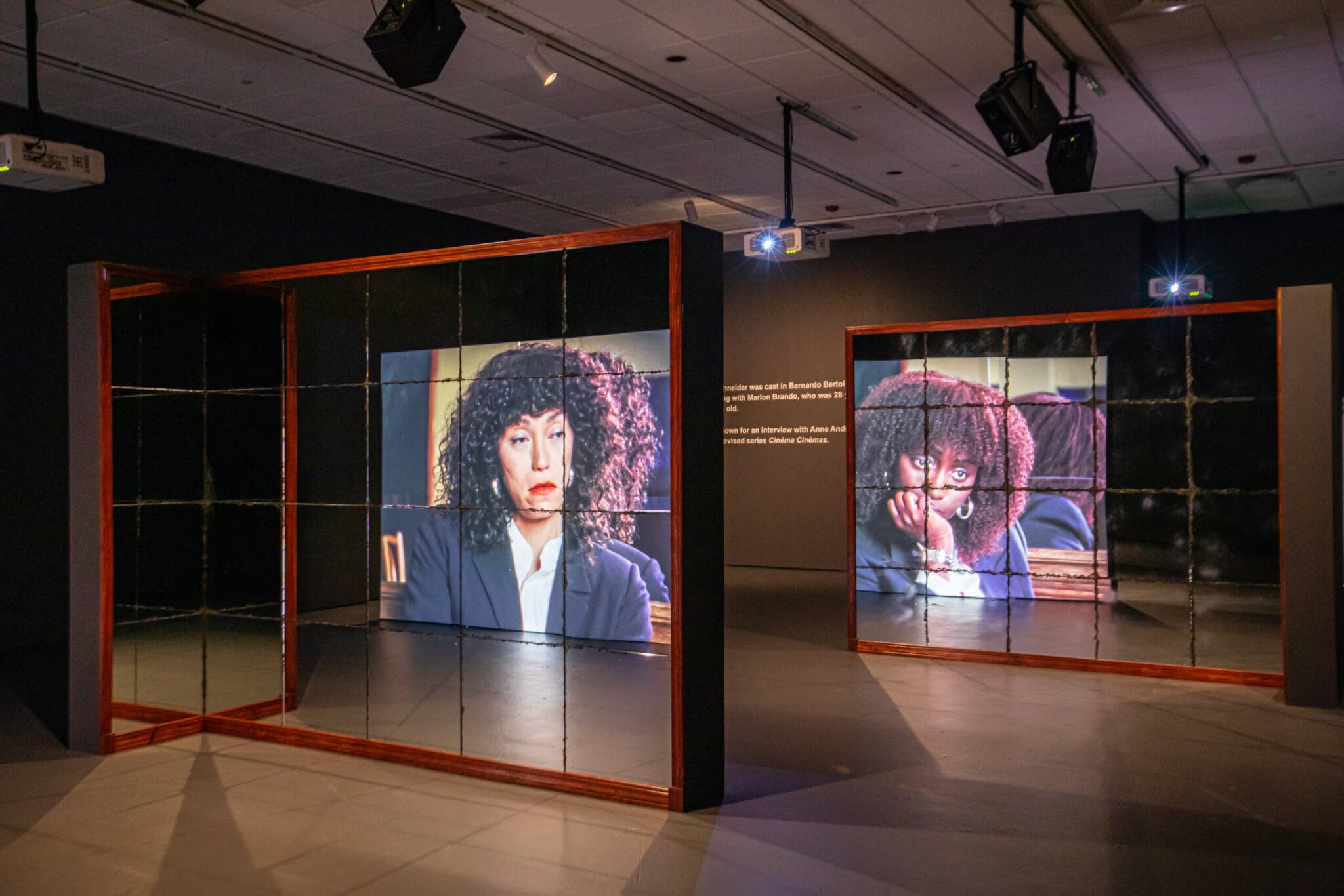 Also, there are the reflections of the projections. So literally on Manal’s back is Aïssa’s reflection—or you could say on Aïssa’s reflection is Manal’s projection. You can see in the ordering of screens how history is moving from Manal to Isabel in the correct chronological timeline. But then that timeline is confused by also reflecting them on the mirrored backs. I was thinking about fragmentation and distortion as another vantage point. Like, what is the difference between looking at Aïssa projected purely and Aïssa that through a grid? It becomes diagnostic and a little bit trappy.