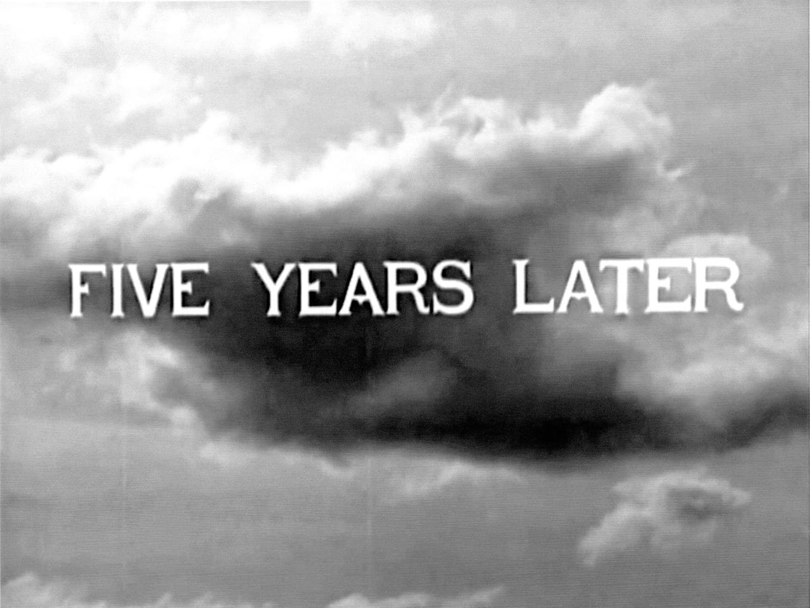 Viewers are first greeted by “I want to tell you.” On a black screen, the title phrase is written in white, flickering slightly as the projection plays and starts over. There are five pieces in the exhibition that use text to assist in conveying a message. One of these intermediary works is “Five years later.” In the film, “FIVE YEARS LATER” is written across streaming clouds in an antiquated serif font. The video is black and white, the clouds rendered in various shades of gray behind the strip of white letters. A question is embedded in the words: five years later than what? When Welitoff employs text, she leaves the viewer even more curious about the construction of time. Two other films present equally ambiguous demarcations: “Two Years”  being one of them, and “The End” being another.
