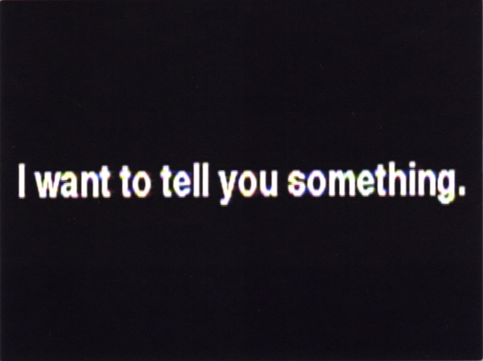 “The air between us” is the only piece that lacks both text or figures entirely. The image is adopted from a clip of Andy Warhol interviewing Mick Jagger, but it is impossible to place (6). A flat screen displays variations of blue, intense but light in shade, almost as though the screen has suffered water damage. Brightest in the top left corner, the sky blue stretches and fades towards the left side of the screen. Any movement on the screen is illusion or imagination, the image itself, though looped video, doesn’t move. Despite the lack of any distinguishable forms and movement, the faint blue alludes to motion, as though looking down on the surface of a body of water.